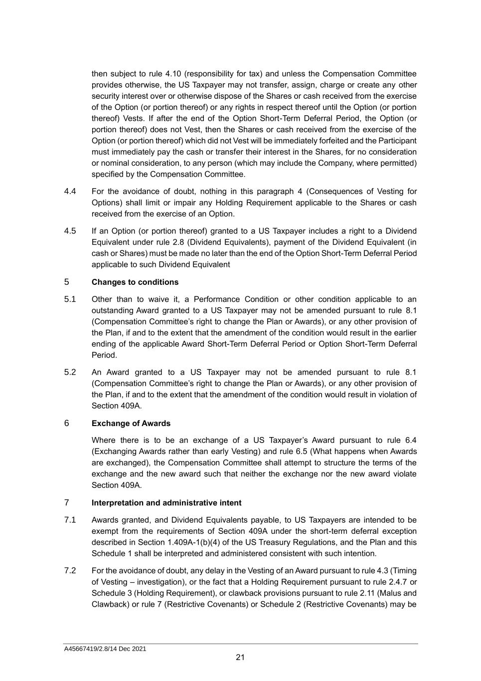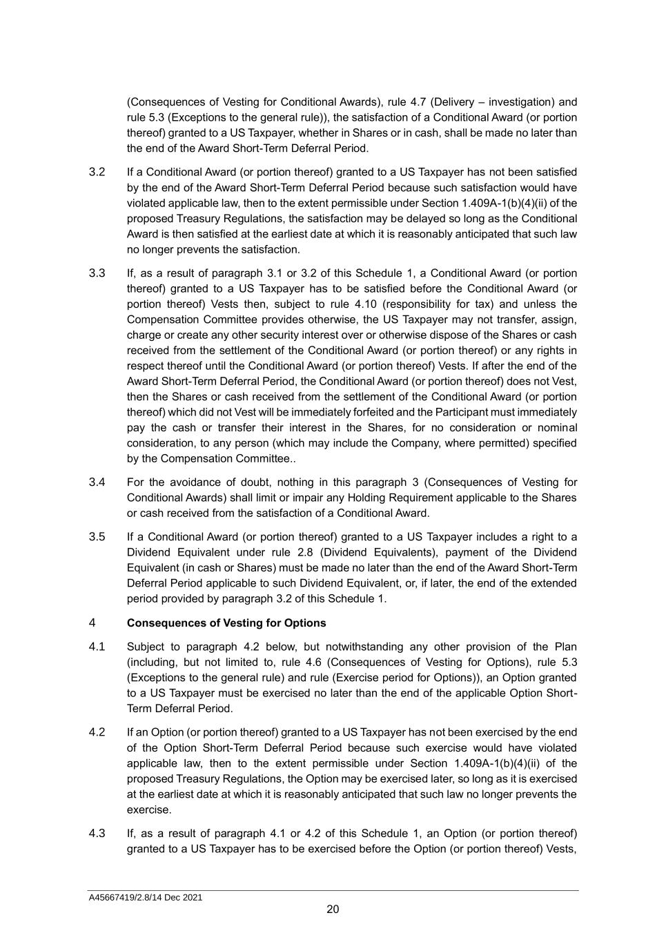 A45667419/2.8/14 Dec 2021 20 (Consequences of Vesting for Conditional Awards), rule 4.7 (Delivery – investigation) and rule 5.3 (Exceptions to the general rule)), the satisfaction of a Conditional Award (or portion thereof) granted to a US Taxpayer, whether in Shares or in cash, shall be made no later than the end of the Award Short-Term Deferral Period. 3.2 If a Conditional Award (or portion thereof) granted to a US Taxpayer has not been satisfied by the end of the Award Short-Term Deferral Period because such satisfaction would have violated applicable law, then to the extent permissible under Section 1.409A-1(b)(4)(ii) of the proposed Treasury Regulations, the satisfaction may be delayed so long as the Conditional Award is then satisfied at the earliest date at which it is reasonably anticipated that such law no longer prevents the satisfaction. 3.3 If, as a result of paragraph 3.1 or 3.2 of this Schedule 1, a Conditional Award (or portion thereof) granted to a US Taxpayer has to be satisfied before the Conditional Award (or portion thereof) Vests then, subject to rule 4.10 (responsibility for tax) and unless the Compensation Committee provides otherwise, the US Taxpayer may not transfer, assign, charge or create any other security interest over or otherwise dispose of the Shares or cash received from the settlement of the Conditional Award (or portion thereof) or any rights in respect thereof until the Conditional Award (or portion thereof) Vests. If after the end of the Award Short-Term Deferral Period, the Conditional Award (or portion thereof) does not Vest, then the Shares or cash received from the settlement of the Conditional Award (or portion thereof) which did not Vest will be immediately forfeited and the Participant must immediately pay the cash or transfer their interest in the Shares, for no consideration or nominal consideration, to any person (which may include the Company, where permitted) specified by the Compensation Committee.. 3.4 For the avoidance of doubt, nothing in this paragraph 3 (Consequences of Vesting for Conditional Awards) shall limit or impair any Holding Requirement applicable to the Shares or cash received from the satisfaction of a Conditional Award. 3.5 If a Conditional Award (or portion thereof) granted to a US Taxpayer includes a right to a Dividend Equivalent under rule 2.8 (Dividend Equivalents), payment of the Dividend Equivalent (in cash or Shares) must be made no later than the end of the Award Short-Term Deferral Period applicable to such Dividend Equivalent, or, if later, the end of the extended period provided by paragraph 3.2 of this Schedule 1. 4 Consequences of Vesting for Options 4.1 Subject to paragraph 4.2 below, but notwithstanding any other provision of the Plan (including, but not limited to, rule 4.6 (Consequences of Vesting for Options), rule 5.3 (Exceptions to the general rule) and rule (Exercise period for Options)), an Option granted to a US Taxpayer must be exercised no later than the end of the applicable Option Short- Term Deferral Period. 4.2 If an Option (or portion thereof) granted to a US Taxpayer has not been exercised by the end of the Option Short-Term Deferral Period because such exercise would have violated applicable law, then to the extent permissible under Section 1.409A-1(b)(4)(ii) of the proposed Treasury Regulations, the Option may be exercised later, so long as it is exercised at the earliest date at which it is reasonably anticipated that such law no longer prevents the exercise. 4.3 If, as a result of paragraph 4.1 or 4.2 of this Schedule 1, an Option (or portion thereof) granted to a US Taxpayer has to be exercised before the Option (or portion thereof) Vests,