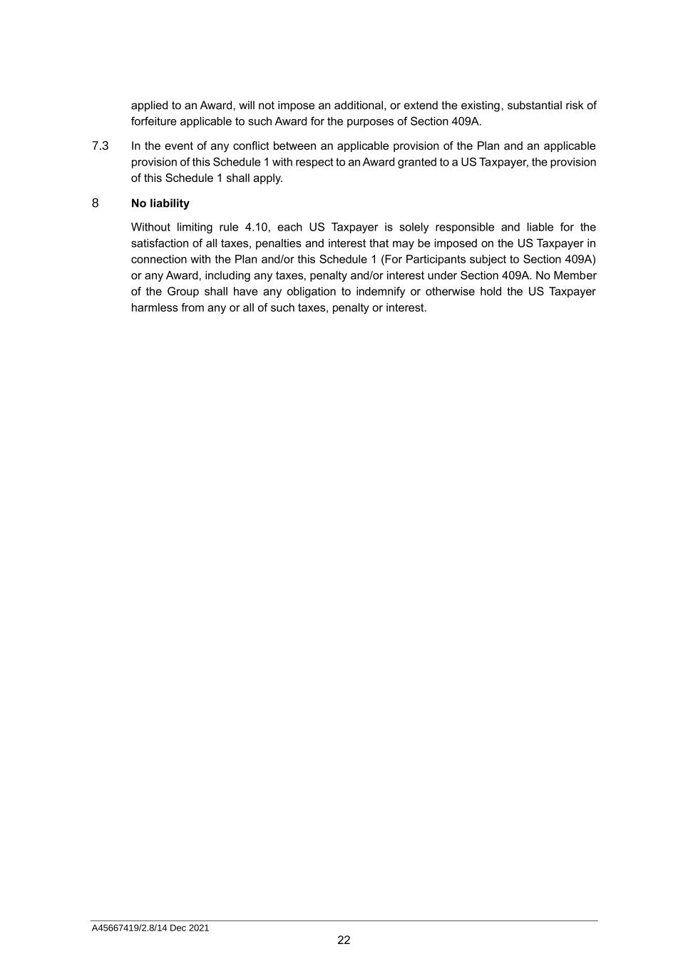 A45667419/2.8/14 Dec 2021 22 applied to an Award, will not impose an additional, or extend the existing, substantial risk of forfeiture applicable to such Award for the purposes of Section 409A. 7.3 In the event of any conflict between an applicable provision of the Plan and an applicable provision of this Schedule 1 with respect to an Award granted to a US Taxpayer, the provision of this Schedule 1 shall apply. 8 No liability Without limiting rule 4.10, each US Taxpayer is solely responsible and liable for the satisfaction of all taxes, penalties and interest that may be imposed on the US Taxpayer in connection with the Plan and/or this Schedule 1 (For Participants subject to Section 409A) or any Award, including any taxes, penalty and/or interest under Section 409A. No Member of the Group shall have any obligation to indemnify or otherwise hold the US Taxpayer harmless from any or all of such taxes, penalty or interest.