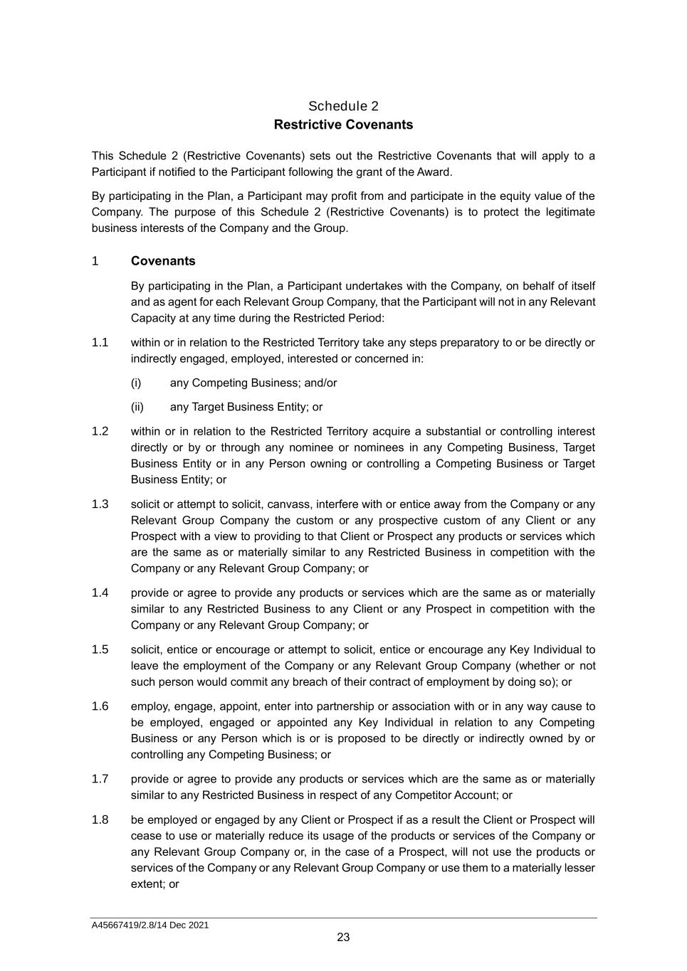 A45667419/2.8/14 Dec 2021 23 Schedule 2 Restrictive Covenants This Schedule 2 (Restrictive Covenants) sets out the Restrictive Covenants that will apply to a Participant if notified to the Participant following the grant of the Award. By participating in the Plan, a Participant may profit from and participate in the equity value of the Company. The purpose of this Schedule 2 (Restrictive Covenants) is to protect the legitimate business interests of the Company and the Group. 1 Covenants By participating in the Plan, a Participant undertakes with the Company, on behalf of itself and as agent for each Relevant Group Company, that the Participant will not in any Relevant Capacity at any time during the Restricted Period: 1.1 within or in relation to the Restricted Territory take any steps preparatory to or be directly or indirectly engaged, employed, interested or concerned in: (i) any Competing Business; and/or (ii) any Target Business Entity; or 1.2 within or in relation to the Restricted Territory acquire a substantial or controlling interest directly or by or through any nominee or nominees in any Competing Business, Target Business Entity or in any Person owning or controlling a Competing Business or Target Business Entity; or 1.3 solicit or attempt to solicit, canvass, interfere with or entice away from the Company or any Relevant Group Company the custom or any prospective custom of any Client or any Prospect with a view to providing to that Client or Prospect any products or services which are the same as or materially similar to any Restricted Business in competition with the Company or any Relevant Group Company; or 1.4 provide or agree to provide any products or services which are the same as or materially similar to any Restricted Business to any Client or any Prospect in competition with the Company or any Relevant Group Company; or 1.5 solicit, entice or encourage or attempt to solicit, entice or encourage any Key Individual to leave the employment of the Company or any Relevant Group Company (whether or not such person would commit any breach of their contract of employment by doing so); or 1.6 employ, engage, appoint, enter into partnership or association with or in any way cause to be employed, engaged or appointed any Key Individual in relation to any Competing Business or any Person which is or is proposed to be directly or indirectly owned by or controlling any Competing Business; or 1.7 provide or agree to provide any products or services which are the same as or materially similar to any Restricted Business in respect of any Competitor Account; or 1.8 be employed or engaged by any Client or Prospect if as a result the Client or Prospect will cease to use or materially reduce its usage of the products or services of the Company or any Relevant Group Company or, in the case of a Prospect, will not use the products or services of the Company or any Relevant Group Company or use them to a materially lesser extent; or