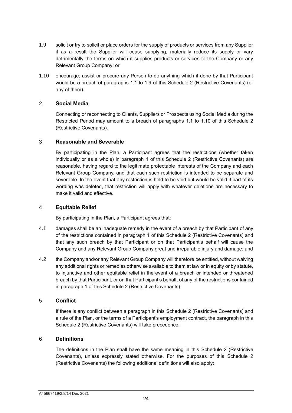 A45667419/2.8/14 Dec 2021 24 1.9 solicit or try to solicit or place orders for the supply of products or services from any Supplier if as a result the Supplier will cease supplying, materially reduce its supply or vary detrimentally the terms on which it supplies products or services to the Company or any Relevant Group Company; or 1.10 encourage, assist or procure any Person to do anything which if done by that Participant would be a breach of paragraphs 1.1 to 1.9 of this Schedule 2 (Restrictive Covenants) (or any of them). 2 Social Media Connecting or reconnecting to Clients, Suppliers or Prospects using Social Media during the Restricted Period may amount to a breach of paragraphs 1.1 to 1.10 of this Schedule 2 (Restrictive Covenants). 3 Reasonable and Severable By participating in the Plan, a Participant agrees that the restrictions (whether taken individually or as a whole) in paragraph 1 of this Schedule 2 (Restrictive Covenants) are reasonable, having regard to the legitimate protectable interests of the Company and each Relevant Group Company, and that each such restriction is intended to be separate and severable. In the event that any restriction is held to be void but would be valid if part of its wording was deleted, that restriction will apply with whatever deletions are necessary to make it valid and effective. 4 Equitable Relief By participating in the Plan, a Participant agrees that: 4.1 damages shall be an inadequate remedy in the event of a breach by that Participant of any of the restrictions contained in paragraph 1 of this Schedule 2 (Restrictive Covenants) and that any such breach by that Participant or on that Participant’s behalf will cause the Company and any Relevant Group Company great and irreparable injury and damage; and 4.2 the Company and/or any Relevant Group Company will therefore be entitled, without waiving any additional rights or remedies otherwise available to them at law or in equity or by statute, to injunctive and other equitable relief in the event of a breach or intended or threatened breach by that Participant, or on that Participant’s behalf, of any of the restrictions contained in paragraph 1 of this Schedule 2 (Restrictive Covenants). 5 Conflict If there is any conflict between a paragraph in this Schedule 2 (Restrictive Covenants) and a rule of the Plan, or the terms of a Participant’s employment contract, the paragraph in this Schedule 2 (Restrictive Covenants) will take precedence. 6 Definitions The definitions in the Plan shall have the same meaning in this Schedule 2 (Restrictive Covenants), unless expressly stated otherwise. For the purposes of this Schedule 2 (Restrictive Covenants) the following additional definitions will also apply: