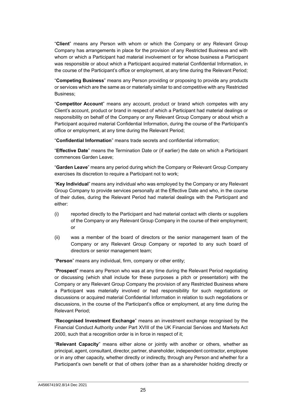 A45667419/2.8/14 Dec 2021 25 “Client” means any Person with whom or which the Company or any Relevant Group Company has arrangements in place for the provision of any Restricted Business and with whom or which a Participant had material involvement or for whose business a Participant was responsible or about which a Participant acquired material Confidential Information, in the course of the Participant’s office or employment, at any time during the Relevant Period; “Competing Business” means any Person providing or proposing to provide any products or services which are the same as or materially similar to and competitive with any Restricted Business; “Competitor Account” means any account, product or brand which competes with any Client’s account, product or brand in respect of which a Participant had material dealings or responsibility on behalf of the Company or any Relevant Group Company or about which a Participant acquired material Confidential Information, during the course of the Participant’s office or employment, at any time during the Relevant Period; “Confidential Information” means trade secrets and confidential information; “Effective Date” means the Termination Date or (if earlier) the date on which a Participant commences Garden Leave; “Garden Leave” means any period during which the Company or Relevant Group Company exercises its discretion to require a Participant not to work; “Key Individual” means any individual who was employed by the Company or any Relevant Group Company to provide services personally at the Effective Date and who, in the course of their duties, during the Relevant Period had material dealings with the Participant and either: (i) reported directly to the Participant and had material contact with clients or suppliers of the Company or any Relevant Group Company in the course of their employment; or (ii) was a member of the board of directors or the senior management team of the Company or any Relevant Group Company or reported to any such board of directors or senior management team; “Person” means any individual, firm, company or other entity; “Prospect” means any Person who was at any time during the Relevant Period negotiating or discussing (which shall include for these purposes a pitch or presentation) with the Company or any Relevant Group Company the provision of any Restricted Business where a Participant was materially involved or had responsibility for such negotiations or discussions or acquired material Confidential Information in relation to such negotiations or discussions, in the course of the Participant’s office or employment, at any time during the Relevant Period; “Recognised Investment Exchange” means an investment exchange recognised by the Financial Conduct Authority under Part XVIII of the UK Financial Services and Markets Act 2000, such that a recognition order is in force in respect of it; “Relevant Capacity” means either alone or jointly with another or others, whether as principal, agent, consultant, director, partner, shareholder, independent contractor, employee or in any other capacity, whether directly or indirectly, through any Person and whether for a Participant’s own benefit or that of others (other than as a shareholder holding directly or