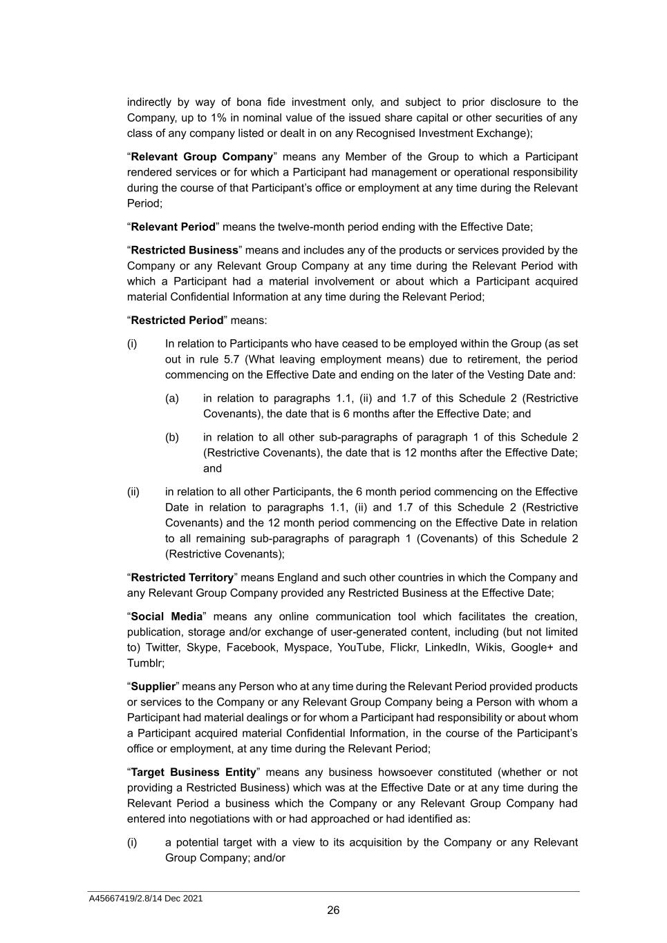 A45667419/2.8/14 Dec 2021 26 indirectly by way of bona fide investment only, and subject to prior disclosure to the Company, up to 1% in nominal value of the issued share capital or other securities of any class of any company listed or dealt in on any Recognised Investment Exchange); “Relevant Group Company” means any Member of the Group to which a Participant rendered services or for which a Participant had management or operational responsibility during the course of that Participant’s office or employment at any time during the Relevant Period; “Relevant Period” means the twelve-month period ending with the Effective Date; “Restricted Business” means and includes any of the products or services provided by the Company or any Relevant Group Company at any time during the Relevant Period with which a Participant had a material involvement or about which a Participant acquired material Confidential Information at any time during the Relevant Period; “Restricted Period” means: (i) In relation to Participants who have ceased to be employed within the Group (as set out in rule 5.7 (What leaving employment means) due to retirement, the period commencing on the Effective Date and ending on the later of the Vesting Date and: (a) in relation to paragraphs 1.1, (ii) and 1.7 of this Schedule 2 (Restrictive Covenants), the date that is 6 months after the Effective Date; and (b) in relation to all other sub-paragraphs of paragraph 1 of this Schedule 2 (Restrictive Covenants), the date that is 12 months after the Effective Date; and (ii) in relation to all other Participants, the 6 month period commencing on the Effective Date in relation to paragraphs 1.1, (ii) and 1.7 of this Schedule 2 (Restrictive Covenants) and the 12 month period commencing on the Effective Date in relation to all remaining sub-paragraphs of paragraph 1 (Covenants) of this Schedule 2 (Restrictive Covenants); “Restricted Territory” means England and such other countries in which the Company and any Relevant Group Company provided any Restricted Business at the Effective Date; “Social Media” means any online communication tool which facilitates the creation, publication, storage and/or exchange of user-generated content, including (but not limited to) Twitter, Skype, Facebook, Myspace, YouTube, Flickr, Linkedln, Wikis, Google+ and Tumblr; “Supplier” means any Person who at any time during the Relevant Period provided products or services to the Company or any Relevant Group Company being a Person with whom a Participant had material dealings or for whom a Participant had responsibility or about whom a Participant acquired material Confidential Information, in the course of the Participant’s office or employment, at any time during the Relevant Period; “Target Business Entity” means any business howsoever constituted (whether or not providing a Restricted Business) which was at the Effective Date or at any time during the Relevant Period a business which the Company or any Relevant Group Company had entered into negotiations with or had approached or had identified as: (i) a potential target with a view to its acquisition by the Company or any Relevant Group Company; and/or