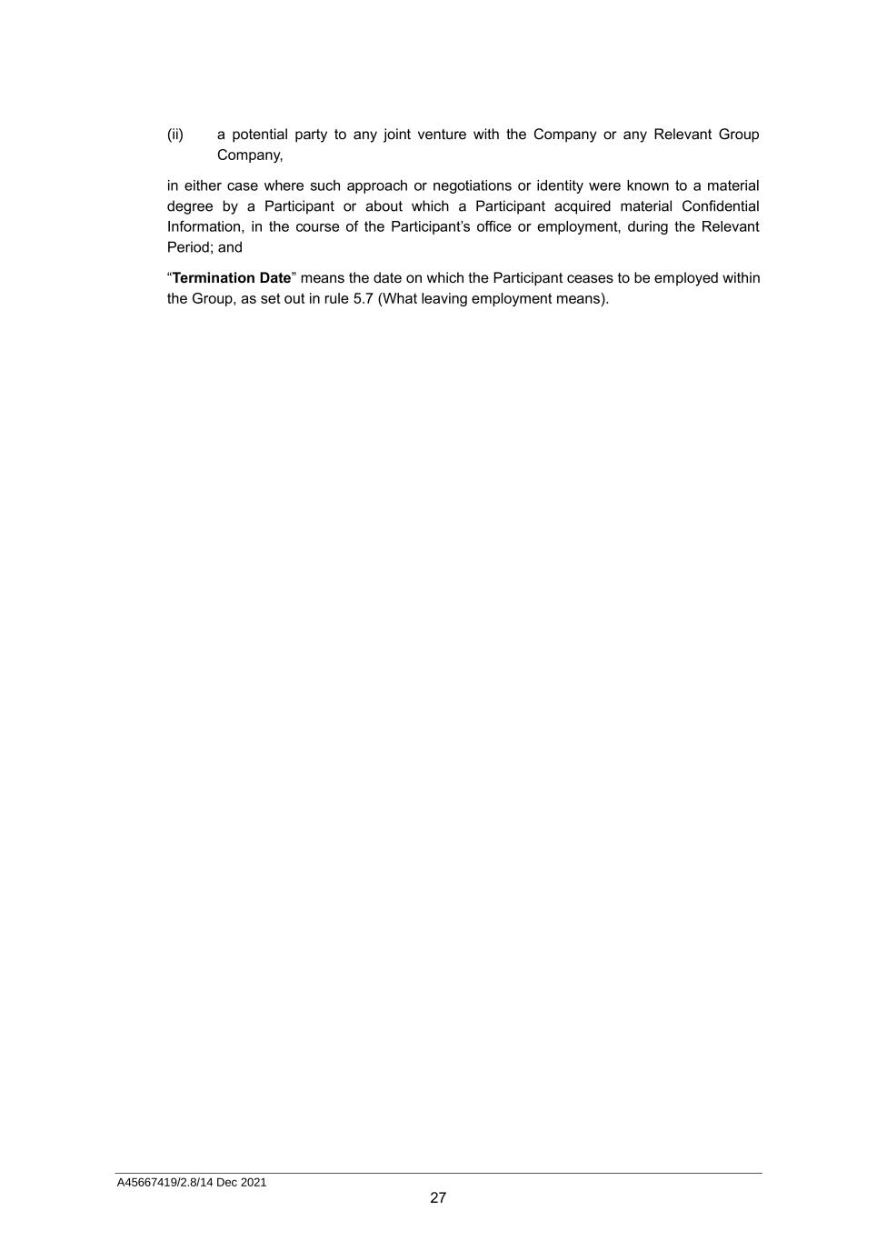 A45667419/2.8/14 Dec 2021 27 (ii) a potential party to any joint venture with the Company or any Relevant Group Company, in either case where such approach or negotiations or identity were known to a material degree by a Participant or about which a Participant acquired material Confidential Information, in the course of the Participant’s office or employment, during the Relevant Period; and “Termination Date” means the date on which the Participant ceases to be employed within the Group, as set out in rule 5.7 (What leaving employment means).