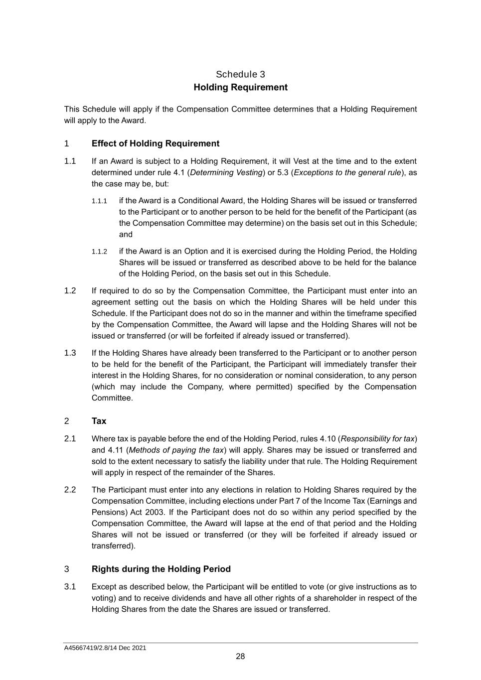 A45667419/2.8/14 Dec 2021 28 Schedule 3 Holding Requirement This Schedule will apply if the Compensation Committee determines that a Holding Requirement will apply to the Award. 1 Effect of Holding Requirement 1.1 If an Award is subject to a Holding Requirement, it will Vest at the time and to the extent determined under rule 4.1 (Determining Vesting) or 5.3 (Exceptions to the general rule), as the case may be, but: 1.1.1 if the Award is a Conditional Award, the Holding Shares will be issued or transferred to the Participant or to another person to be held for the benefit of the Participant (as the Compensation Committee may determine) on the basis set out in this Schedule; and 1.1.2 if the Award is an Option and it is exercised during the Holding Period, the Holding Shares will be issued or transferred as described above to be held for the balance of the Holding Period, on the basis set out in this Schedule. 1.2 If required to do so by the Compensation Committee, the Participant must enter into an agreement setting out the basis on which the Holding Shares will be held under this Schedule. If the Participant does not do so in the manner and within the timeframe specified by the Compensation Committee, the Award will lapse and the Holding Shares will not be issued or transferred (or will be forfeited if already issued or transferred). 1.3 If the Holding Shares have already been transferred to the Participant or to another person to be held for the benefit of the Participant, the Participant will immediately transfer their interest in the Holding Shares, for no consideration or nominal consideration, to any person (which may include the Company, where permitted) specified by the Compensation Committee. 2 Tax 2.1 Where tax is payable before the end of the Holding Period, rules 4.10 (Responsibility for tax) and 4.11 (Methods of paying the tax) will apply. Shares may be issued or transferred and sold to the extent necessary to satisfy the liability under that rule. The Holding Requirement will apply in respect of the remainder of the Shares. 2.2 The Participant must enter into any elections in relation to Holding Shares required by the Compensation Committee, including elections under Part 7 of the Income Tax (Earnings and Pensions) Act 2003. If the Participant does not do so within any period specified by the Compensation Committee, the Award will lapse at the end of that period and the Holding Shares will not be issued or transferred (or they will be forfeited if already issued or transferred). 3 Rights during the Holding Period 3.1 Except as described below, the Participant will be entitled to vote (or give instructions as to voting) and to receive dividends and have all other rights of a shareholder in respect of the Holding Shares from the date the Shares are issued or transferred.