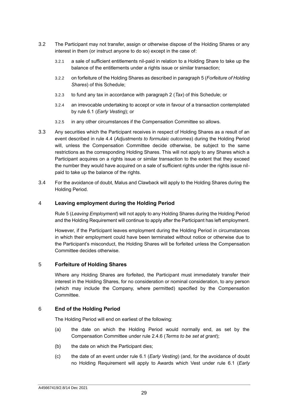 A45667419/2.8/14 Dec 2021 29 3.2 The Participant may not transfer, assign or otherwise dispose of the Holding Shares or any interest in them (or instruct anyone to do so) except in the case of: 3.2.1 a sale of sufficient entitlements nil-paid in relation to a Holding Share to take up the balance of the entitlements under a rights issue or similar transaction; 3.2.2 on forfeiture of the Holding Shares as described in paragraph 5 (Forfeiture of Holding Shares) of this Schedule; 3.2.3 to fund any tax in accordance with paragraph 2 (Tax) of this Schedule; or 3.2.4 an irrevocable undertaking to accept or vote in favour of a transaction contemplated by rule 6.1 (Early Vesting); or 3.2.5 in any other circumstances if the Compensation Committee so allows. 3.3 Any securities which the Participant receives in respect of Holding Shares as a result of an event described in rule 4.4 (Adjustments to formulaic outcomes) during the Holding Period will, unless the Compensation Committee decide otherwise, be subject to the same restrictions as the corresponding Holding Shares. This will not apply to any Shares which a Participant acquires on a rights issue or similar transaction to the extent that they exceed the number they would have acquired on a sale of sufficient rights under the rights issue nil- paid to take up the balance of the rights. 3.4 For the avoidance of doubt, Malus and Clawback will apply to the Holding Shares during the Holding Period. 4 Leaving employment during the Holding Period Rule 5 (Leaving Employment) will not apply to any Holding Shares during the Holding Period and the Holding Requirement will continue to apply after the Participant has left employment. However, if the Participant leaves employment during the Holding Period in circumstances in which their employment could have been terminated without notice or otherwise due to the Participant’s misconduct, the Holding Shares will be forfeited unless the Compensation Committee decides otherwise. 5 Forfeiture of Holding Shares Where any Holding Shares are forfeited, the Participant must immediately transfer their interest in the Holding Shares, for no consideration or nominal consideration, to any person (which may include the Company, where permitted) specified by the Compensation Committee. 6 End of the Holding Period The Holding Period will end on earliest of the following: (a) the date on which the Holding Period would normally end, as set by the Compensation Committee under rule 2.4.6 (Terms to be set at grant); (b) the date on which the Participant dies; (c) the date of an event under rule 6.1 (Early Vesting) (and, for the avoidance of doubt no Holding Requirement will apply to Awards which Vest under rule 6.1 (Early
