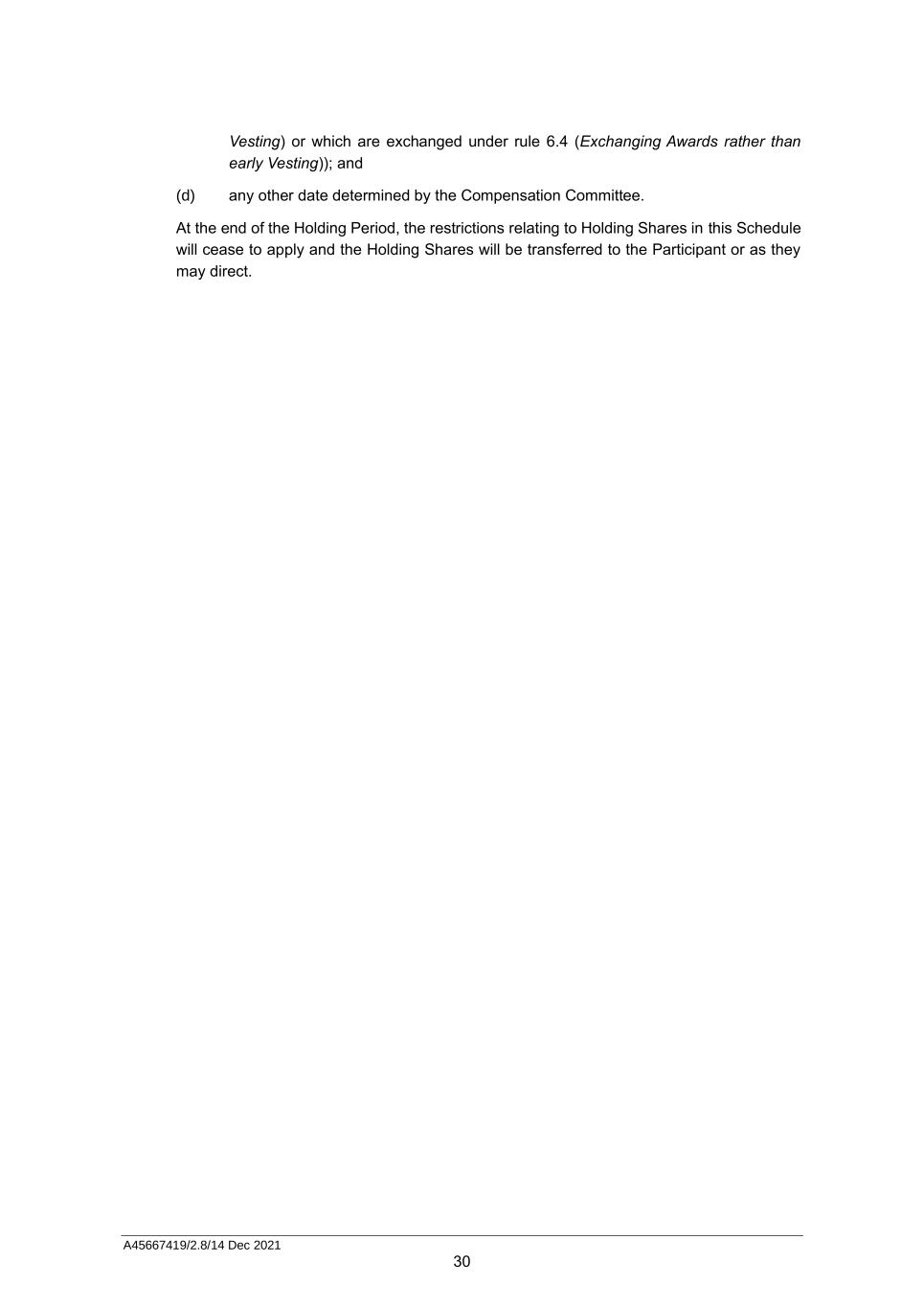 A45667419/2.8/14 Dec 2021 30 Vesting) or which are exchanged under rule 6.4 (Exchanging Awards rather than early Vesting)); and (d) any other date determined by the Compensation Committee. At the end of the Holding Period, the restrictions relating to Holding Shares in this Schedule will cease to apply and the Holding Shares will be transferred to the Participant or as they may direct.