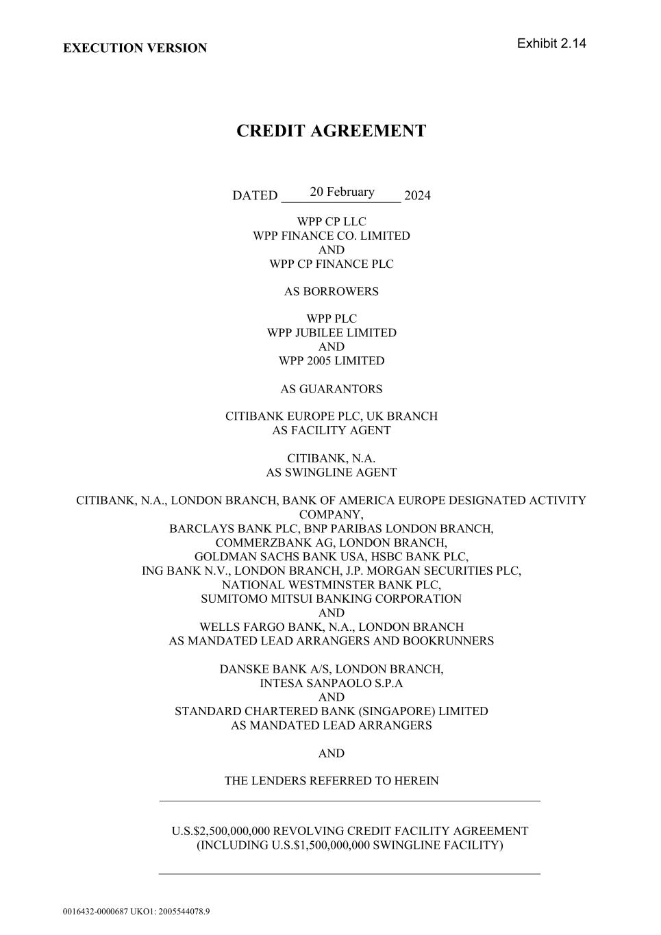 EXECUTION VERSION 0016432-0000687 UKO1: 2005544078.9 CREDIT AGREEMENT DATED __________________ 2024 WPP CP LLC WPP FINANCE CO. LIMITED AND WPP CP FINANCE PLC AS BORROWERS WPP PLC WPP JUBILEE LIMITED AND WPP 2005 LIMITED AS GUARANTORS CITIBANK EUROPE PLC, UK BRANCH AS FACILITY AGENT CITIBANK, N.A. AS SWINGLINE AGENT CITIBANK, N.A., LONDON BRANCH, BANK OF AMERICA EUROPE DESIGNATED ACTIVITY COMPANY, BARCLAYS BANK PLC, BNP PARIBAS LONDON BRANCH, COMMERZBANK AG, LONDON BRANCH, GOLDMAN SACHS BANK USA, HSBC BANK PLC, ING BANK N.V., LONDON BRANCH, J.P. MORGAN SECURITIES PLC, NATIONAL WESTMINSTER BANK PLC, SUMITOMO MITSUI BANKING CORPORATION AND WELLS FARGO BANK, N.A., LONDON BRANCH AS MANDATED LEAD ARRANGERS AND BOOKRUNNERS DANSKE BANK A/S, LONDON BRANCH, INTESA SANPAOLO S.P.A AND STANDARD CHARTERED BANK (SINGAPORE) LIMITED AS MANDATED LEAD ARRANGERS AND THE LENDERS REFERRED TO HEREIN U.S.$2,500,000,000 REVOLVING CREDIT FACILITY AGREEMENT (INCLUDING U.S.$1,500,000,000 SWINGLINE FACILITY) 20 February Exhibit 2.14