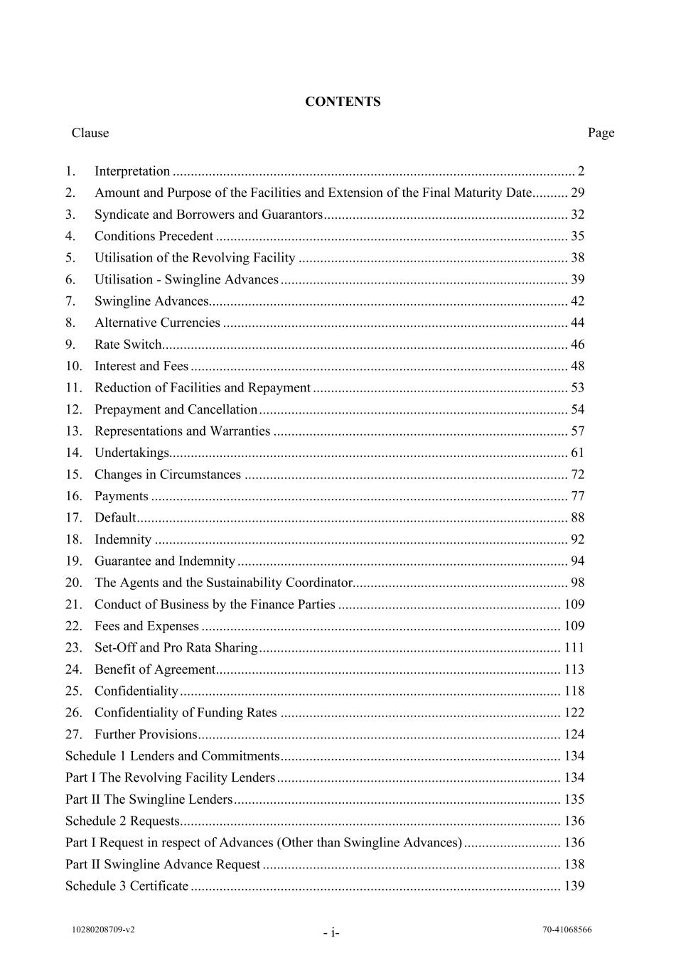 10280208709-v2 - i- 70-41068566 CONTENTS Clause Page 1. Interpretation ................................................................................................................ 2 2. Amount and Purpose of the Facilities and Extension of the Final Maturity Date .......... 29 3. Syndicate and Borrowers and Guarantors .................................................................... 32 4. Conditions Precedent .................................................................................................. 35 5. Utilisation of the Revolving Facility ........................................................................... 38 6. Utilisation - Swingline Advances ................................................................................ 39 7. Swingline Advances.................................................................................................... 42 8. Alternative Currencies ................................................................................................ 44 9. Rate Switch................................................................................................................. 46 10. Interest and Fees ......................................................................................................... 48 11. Reduction of Facilities and Repayment ....................................................................... 53 12. Prepayment and Cancellation ...................................................................................... 54 13. Representations and Warranties .................................................................................. 57 14. Undertakings............................................................................................................... 61 15. Changes in Circumstances .......................................................................................... 72 16. Payments .................................................................................................................... 77 17. Default ........................................................................................................................ 88 18. Indemnity ................................................................................................................... 92 19. Guarantee and Indemnity ............................................................................................ 94 20. The Agents and the Sustainability Coordinator............................................................ 98 21. Conduct of Business by the Finance Parties .............................................................. 109 22. Fees and Expenses .................................................................................................... 109 23. Set-Off and Pro Rata Sharing .................................................................................... 111 24. Benefit of Agreement ................................................................................................ 113 25. Confidentiality .......................................................................................................... 118 26. Confidentiality of Funding Rates .............................................................................. 122 27. Further Provisions ..................................................................................................... 124 Schedule 1 Lenders and Commitments .............................................................................. 134 Part I The Revolving Facility Lenders ............................................................................... 134 Part II The Swingline Lenders ........................................................................................... 135 Schedule 2 Requests.......................................................................................................... 136 Part I Request in respect of Advances (Other than Swingline Advances) ........................... 136 Part II Swingline Advance Request ................................................................................... 138 Schedule 3 Certificate ....................................................................................................... 139