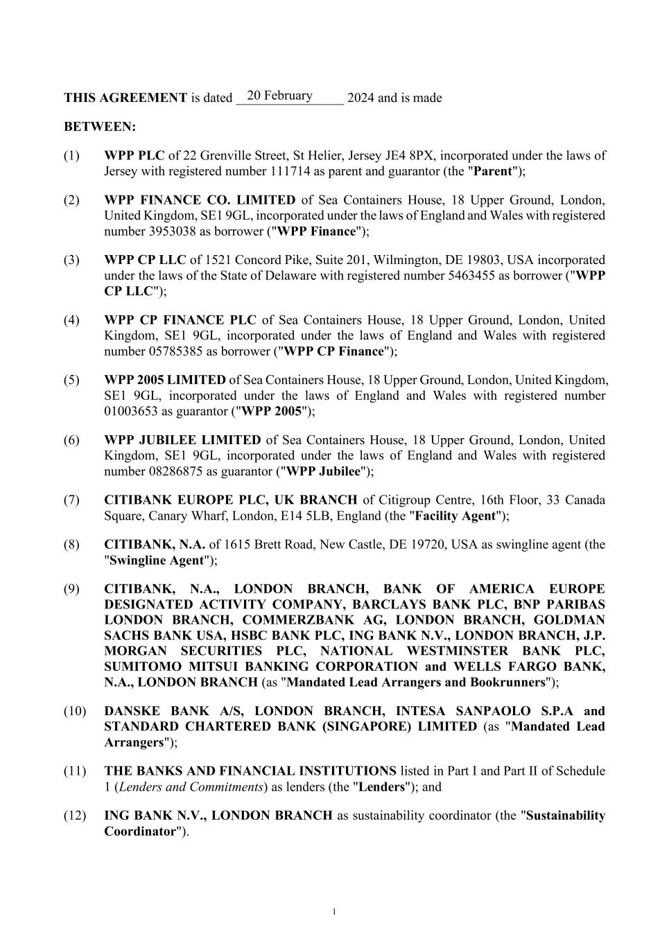 1 THIS AGREEMENT is dated ________________ 2024 and is made BETWEEN: (1) WPP PLC of 22 Grenville Street, St Helier, Jersey JE4 8PX, incorporated under the laws of Jersey with registered number 111714 as parent and guarantor (the "Parent"); (2) WPP FINANCE CO. LIMITED of Sea Containers House, 18 Upper Ground, London, United Kingdom, SE1 9GL, incorporated under the laws of England and Wales with registered number 3953038 as borrower ("WPP Finance"); (3) WPP CP LLC of 1521 Concord Pike, Suite 201, Wilmington, DE 19803, USA incorporated under the laws of the State of Delaware with registered number 5463455 as borrower ("WPP CP LLC"); (4) WPP CP FINANCE PLC of Sea Containers House, 18 Upper Ground, London, United Kingdom, SE1 9GL, incorporated under the laws of England and Wales with registered number 05785385 as borrower ("WPP CP Finance"); (5) WPP 2005 LIMITED of Sea Containers House, 18 Upper Ground, London, United Kingdom, SE1 9GL, incorporated under the laws of England and Wales with registered number 01003653 as guarantor ("WPP 2005"); (6) WPP JUBILEE LIMITED of Sea Containers House, 18 Upper Ground, London, United Kingdom, SE1 9GL, incorporated under the laws of England and Wales with registered number 08286875 as guarantor ("WPP Jubilee"); (7) CITIBANK EUROPE PLC, UK BRANCH of Citigroup Centre, 16th Floor, 33 Canada Square, Canary Wharf, London, E14 5LB, England (the "Facility Agent"); (8) CITIBANK, N.A. of 1615 Brett Road, New Castle, DE 19720, USA as swingline agent (the "Swingline Agent"); (9) CITIBANK, N.A., LONDON BRANCH, BANK OF AMERICA EUROPE DESIGNATED ACTIVITY COMPANY, BARCLAYS BANK PLC, BNP PARIBAS LONDON BRANCH, COMMERZBANK AG, LONDON BRANCH, GOLDMAN SACHS BANK USA, HSBC BANK PLC, ING BANK N.V., LONDON BRANCH, J.P. MORGAN SECURITIES PLC, NATIONAL WESTMINSTER BANK PLC, SUMITOMO MITSUI BANKING CORPORATION and WELLS FARGO BANK, N.A., LONDON BRANCH (as "Mandated Lead Arrangers and Bookrunners"); (10) DANSKE BANK A/S, LONDON BRANCH, INTESA SANPAOLO S.P.A and STANDARD CHARTERED BANK (SINGAPORE) LIMITED (as "Mandated Lead Arrangers"); (11) THE BANKS AND FINANCIAL INSTITUTIONS listed in Part I and Part II of Schedule 1 (Lenders and Commitments) as lenders (the "Lenders"); and (12) ING BANK N.V., LONDON BRANCH as sustainability coordinator (the "Sustainability Coordinator"). 20 February
