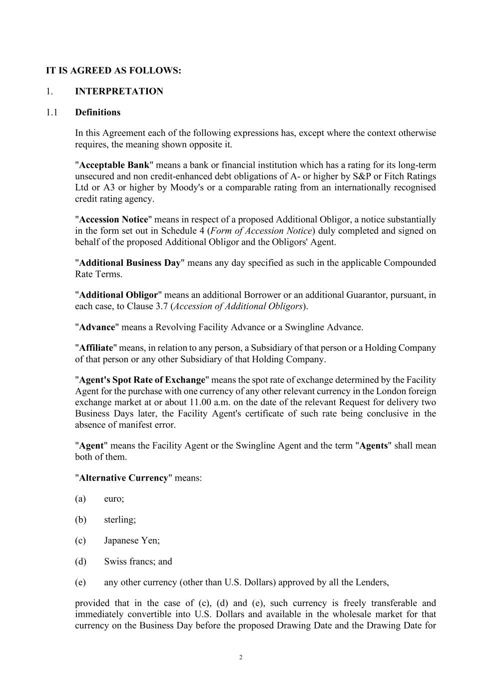 2 IT IS AGREED AS FOLLOWS: 1. INTERPRETATION 1.1 Definitions In this Agreement each of the following expressions has, except where the context otherwise requires, the meaning shown opposite it. "Acceptable Bank" means a bank or financial institution which has a rating for its long-term unsecured and non credit-enhanced debt obligations of A- or higher by S&P or Fitch Ratings Ltd or A3 or higher by Moody's or a comparable rating from an internationally recognised credit rating agency. "Accession Notice" means in respect of a proposed Additional Obligor, a notice substantially in the form set out in Schedule 4 (Form of Accession Notice) duly completed and signed on behalf of the proposed Additional Obligor and the Obligors' Agent. "Additional Business Day" means any day specified as such in the applicable Compounded Rate Terms. "Additional Obligor" means an additional Borrower or an additional Guarantor, pursuant, in each case, to Clause 3.7 (Accession of Additional Obligors). "Advance" means a Revolving Facility Advance or a Swingline Advance. "Affiliate" means, in relation to any person, a Subsidiary of that person or a Holding Company of that person or any other Subsidiary of that Holding Company. "Agent's Spot Rate of Exchange" means the spot rate of exchange determined by the Facility Agent for the purchase with one currency of any other relevant currency in the London foreign exchange market at or about 11.00 a.m. on the date of the relevant Request for delivery two Business Days later, the Facility Agent's certificate of such rate being conclusive in the absence of manifest error. "Agent" means the Facility Agent or the Swingline Agent and the term "Agents" shall mean both of them. "Alternative Currency" means: (a) euro; (b) sterling; (c) Japanese Yen; (d) Swiss francs; and (e) any other currency (other than U.S. Dollars) approved by all the Lenders, provided that in the case of (c), (d) and (e), such currency is freely transferable and immediately convertible into U.S. Dollars and available in the wholesale market for that currency on the Business Day before the proposed Drawing Date and the Drawing Date for
