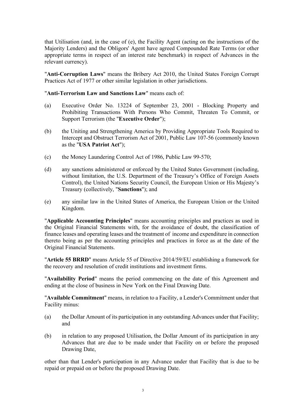 3 that Utilisation (and, in the case of (e), the Facility Agent (acting on the instructions of the Majority Lenders) and the Obligors' Agent have agreed Compounded Rate Terms (or other appropriate terms in respect of an interest rate benchmark) in respect of Advances in the relevant currency). "Anti-Corruption Laws" means the Bribery Act 2010, the United States Foreign Corrupt Practices Act of 1977 or other similar legislation in other jurisdictions. "Anti-Terrorism Law and Sanctions Law" means each of: (a) Executive Order No. 13224 of September 23, 2001 - Blocking Property and Prohibiting Transactions With Persons Who Commit, Threaten To Commit, or Support Terrorism (the "Executive Order"); (b) the Uniting and Strengthening America by Providing Appropriate Tools Required to Intercept and Obstruct Terrorism Act of 2001, Public Law 107-56 (commonly known as the "USA Patriot Act"); (c) the Money Laundering Control Act of 1986, Public Law 99-570; (d) any sanctions administered or enforced by the United States Government (including, without limitation, the U.S. Department of the Treasury’s Office of Foreign Assets Control), the United Nations Security Council, the European Union or His Majesty’s Treasury (collectively, "Sanctions"); and (e) any similar law in the United States of America, the European Union or the United Kingdom. "Applicable Accounting Principles" means accounting principles and practices as used in the Original Financial Statements with, for the avoidance of doubt, the classification of finance leases and operating leases and the treatment of income and expenditure in connection thereto being as per the accounting principles and practices in force as at the date of the Original Financial Statements. "Article 55 BRRD" means Article 55 of Directive 2014/59/EU establishing a framework for the recovery and resolution of credit institutions and investment firms. "Availability Period" means the period commencing on the date of this Agreement and ending at the close of business in New York on the Final Drawing Date. "Available Commitment" means, in relation to a Facility, a Lender's Commitment under that Facility minus: (a) the Dollar Amount of its participation in any outstanding Advances under that Facility; and (b) in relation to any proposed Utilisation, the Dollar Amount of its participation in any Advances that are due to be made under that Facility on or before the proposed Drawing Date, other than that Lender's participation in any Advance under that Facility that is due to be repaid or prepaid on or before the proposed Drawing Date.