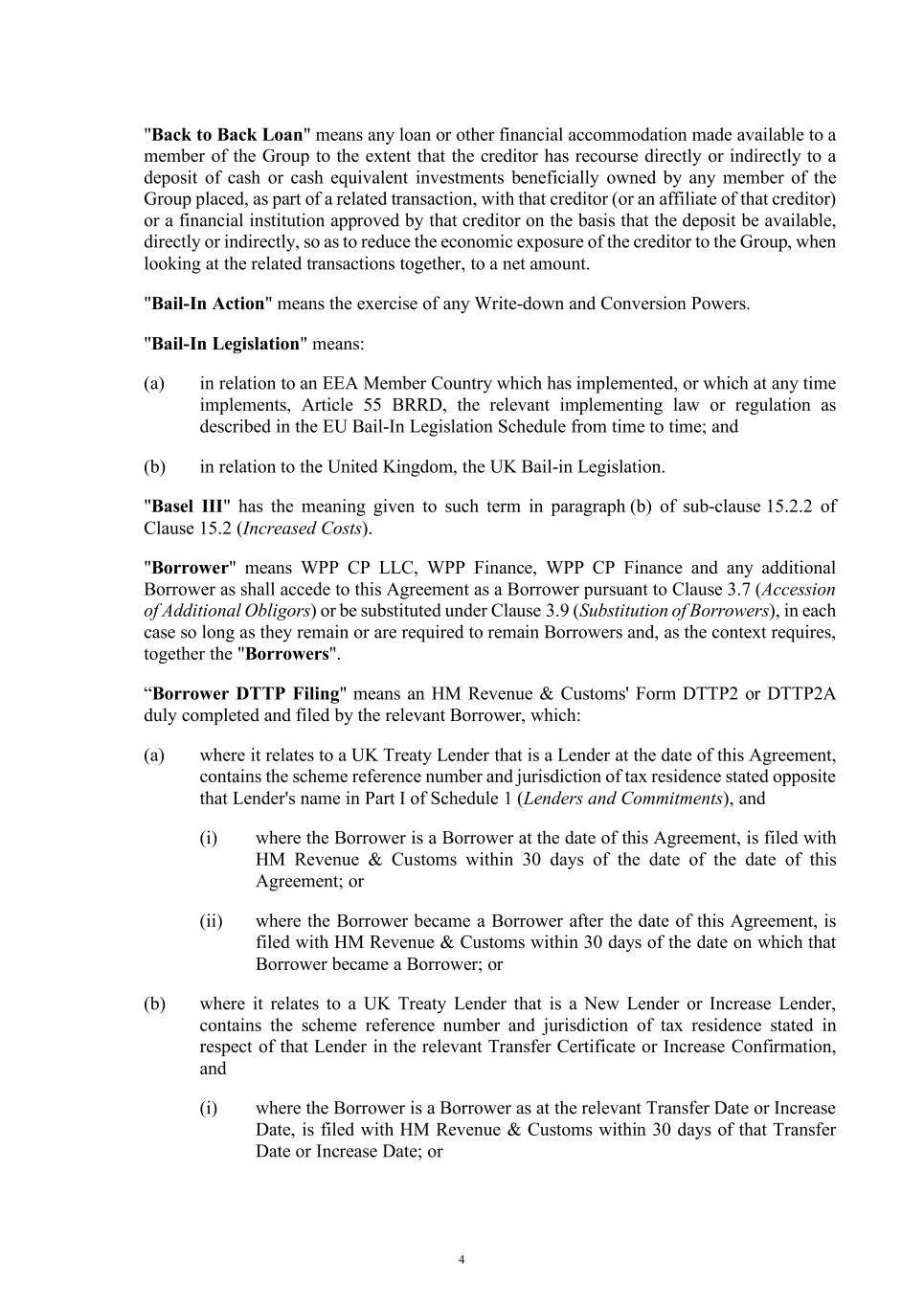 4 "Back to Back Loan" means any loan or other financial accommodation made available to a member of the Group to the extent that the creditor has recourse directly or indirectly to a deposit of cash or cash equivalent investments beneficially owned by any member of the Group placed, as part of a related transaction, with that creditor (or an affiliate of that creditor) or a financial institution approved by that creditor on the basis that the deposit be available, directly or indirectly, so as to reduce the economic exposure of the creditor to the Group, when looking at the related transactions together, to a net amount. "Bail-In Action" means the exercise of any Write-down and Conversion Powers. "Bail-In Legislation" means: (a) in relation to an EEA Member Country which has implemented, or which at any time implements, Article 55 BRRD, the relevant implementing law or regulation as described in the EU Bail-In Legislation Schedule from time to time; and (b) in relation to the United Kingdom, the UK Bail-in Legislation. "Basel III" has the meaning given to such term in paragraph (b) of sub-clause 15.2.2 of Clause 15.2 (Increased Costs). "Borrower" means WPP CP LLC, WPP Finance, WPP CP Finance and any additional Borrower as shall accede to this Agreement as a Borrower pursuant to Clause 3.7 (Accession of Additional Obligors) or be substituted under Clause 3.9 (Substitution of Borrowers), in each case so long as they remain or are required to remain Borrowers and, as the context requires, together the "Borrowers". “Borrower DTTP Filing" means an HM Revenue & Customs' Form DTTP2 or DTTP2A duly completed and filed by the relevant Borrower, which: (a) where it relates to a UK Treaty Lender that is a Lender at the date of this Agreement, contains the scheme reference number and jurisdiction of tax residence stated opposite that Lender's name in Part I of Schedule 1 (Lenders and Commitments), and (i) where the Borrower is a Borrower at the date of this Agreement, is filed with HM Revenue & Customs within 30 days of the date of the date of this Agreement; or (ii) where the Borrower became a Borrower after the date of this Agreement, is filed with HM Revenue & Customs within 30 days of the date on which that Borrower became a Borrower; or (b) where it relates to a UK Treaty Lender that is a New Lender or Increase Lender, contains the scheme reference number and jurisdiction of tax residence stated in respect of that Lender in the relevant Transfer Certificate or Increase Confirmation, and (i) where the Borrower is a Borrower as at the relevant Transfer Date or Increase Date, is filed with HM Revenue & Customs within 30 days of that Transfer Date or Increase Date; or