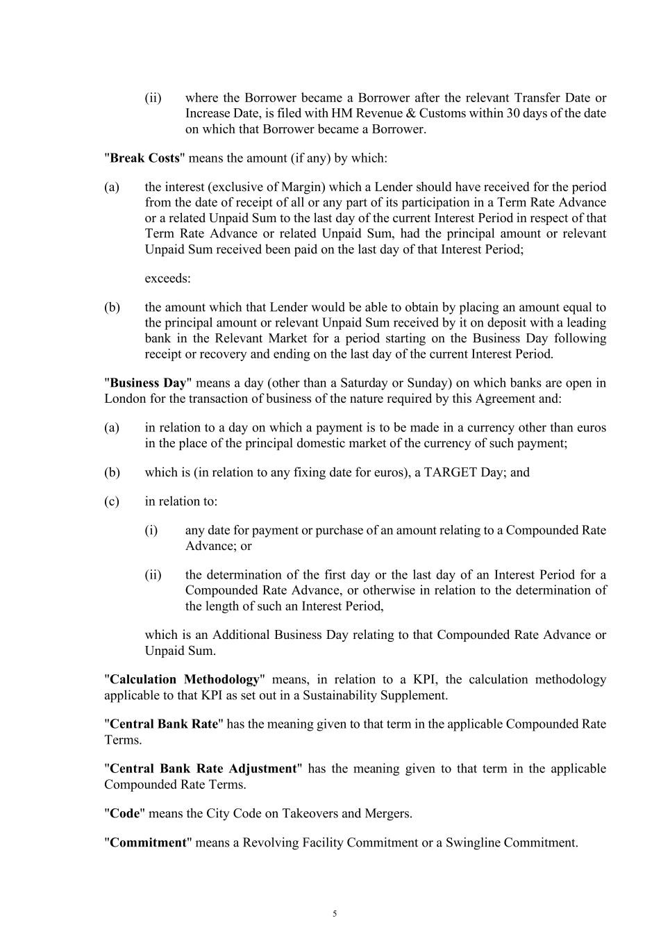 5 (ii) where the Borrower became a Borrower after the relevant Transfer Date or Increase Date, is filed with HM Revenue & Customs within 30 days of the date on which that Borrower became a Borrower. "Break Costs" means the amount (if any) by which: (a) the interest (exclusive of Margin) which a Lender should have received for the period from the date of receipt of all or any part of its participation in a Term Rate Advance or a related Unpaid Sum to the last day of the current Interest Period in respect of that Term Rate Advance or related Unpaid Sum, had the principal amount or relevant Unpaid Sum received been paid on the last day of that Interest Period; exceeds: (b) the amount which that Lender would be able to obtain by placing an amount equal to the principal amount or relevant Unpaid Sum received by it on deposit with a leading bank in the Relevant Market for a period starting on the Business Day following receipt or recovery and ending on the last day of the current Interest Period. "Business Day" means a day (other than a Saturday or Sunday) on which banks are open in London for the transaction of business of the nature required by this Agreement and: (a) in relation to a day on which a payment is to be made in a currency other than euros in the place of the principal domestic market of the currency of such payment; (b) which is (in relation to any fixing date for euros), a TARGET Day; and (c) in relation to: (i) any date for payment or purchase of an amount relating to a Compounded Rate Advance; or (ii) the determination of the first day or the last day of an Interest Period for a Compounded Rate Advance, or otherwise in relation to the determination of the length of such an Interest Period, which is an Additional Business Day relating to that Compounded Rate Advance or Unpaid Sum. "Calculation Methodology" means, in relation to a KPI, the calculation methodology applicable to that KPI as set out in a Sustainability Supplement. "Central Bank Rate" has the meaning given to that term in the applicable Compounded Rate Terms. "Central Bank Rate Adjustment" has the meaning given to that term in the applicable Compounded Rate Terms. "Code" means the City Code on Takeovers and Mergers. "Commitment" means a Revolving Facility Commitment or a Swingline Commitment.