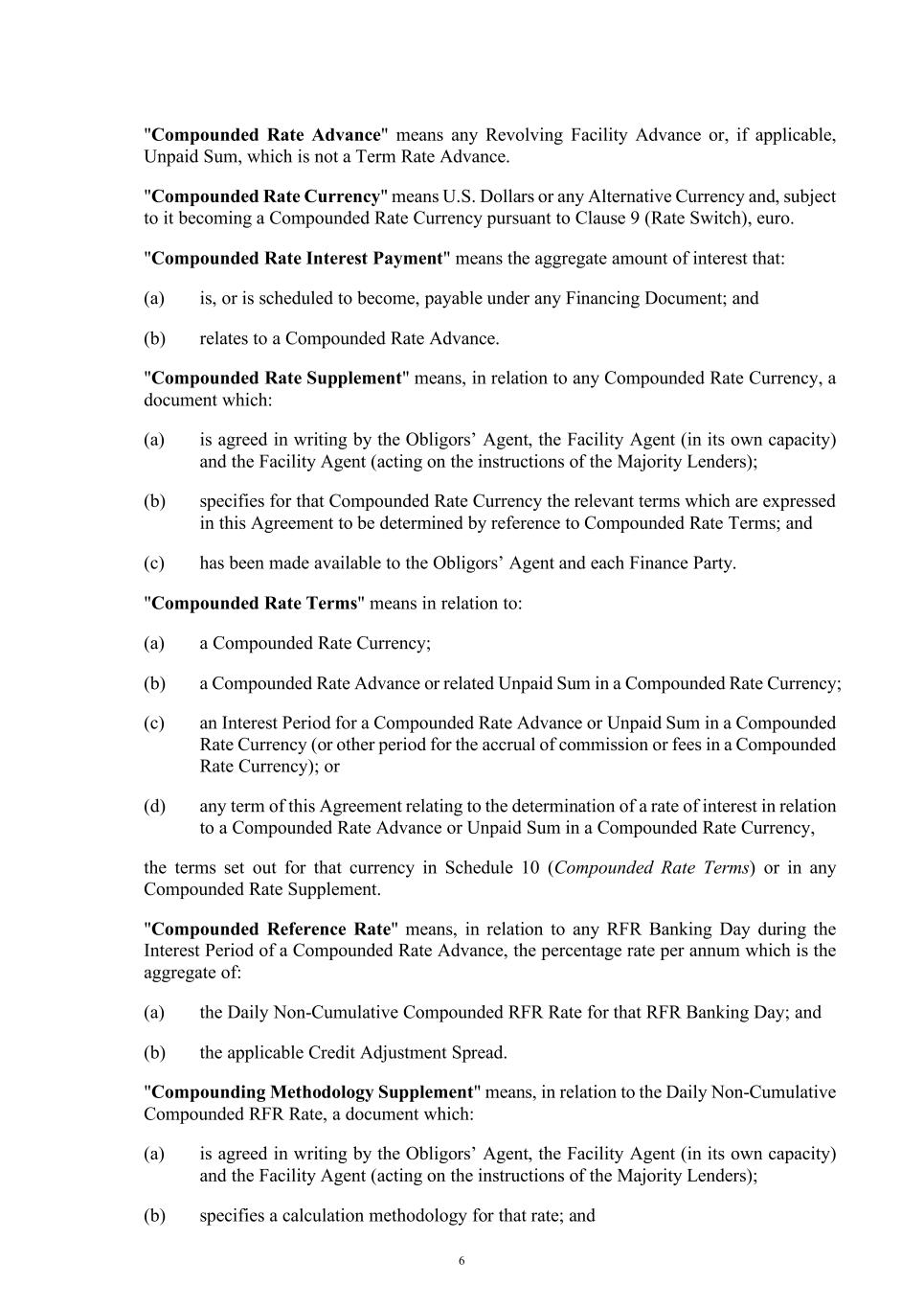 6 "Compounded Rate Advance" means any Revolving Facility Advance or, if applicable, Unpaid Sum, which is not a Term Rate Advance. "Compounded Rate Currency" means U.S. Dollars or any Alternative Currency and, subject to it becoming a Compounded Rate Currency pursuant to Clause 9 (Rate Switch), euro. "Compounded Rate Interest Payment" means the aggregate amount of interest that: (a) is, or is scheduled to become, payable under any Financing Document; and (b) relates to a Compounded Rate Advance. "Compounded Rate Supplement" means, in relation to any Compounded Rate Currency, a document which: (a) is agreed in writing by the Obligors’ Agent, the Facility Agent (in its own capacity) and the Facility Agent (acting on the instructions of the Majority Lenders); (b) specifies for that Compounded Rate Currency the relevant terms which are expressed in this Agreement to be determined by reference to Compounded Rate Terms; and (c) has been made available to the Obligors’ Agent and each Finance Party. "Compounded Rate Terms" means in relation to: (a) a Compounded Rate Currency; (b) a Compounded Rate Advance or related Unpaid Sum in a Compounded Rate Currency; (c) an Interest Period for a Compounded Rate Advance or Unpaid Sum in a Compounded Rate Currency (or other period for the accrual of commission or fees in a Compounded Rate Currency); or (d) any term of this Agreement relating to the determination of a rate of interest in relation to a Compounded Rate Advance or Unpaid Sum in a Compounded Rate Currency, the terms set out for that currency in Schedule 10 (Compounded Rate Terms) or in any Compounded Rate Supplement. "Compounded Reference Rate" means, in relation to any RFR Banking Day during the Interest Period of a Compounded Rate Advance, the percentage rate per annum which is the aggregate of: (a) the Daily Non-Cumulative Compounded RFR Rate for that RFR Banking Day; and (b) the applicable Credit Adjustment Spread. "Compounding Methodology Supplement" means, in relation to the Daily Non-Cumulative Compounded RFR Rate, a document which: (a) is agreed in writing by the Obligors’ Agent, the Facility Agent (in its own capacity) and the Facility Agent (acting on the instructions of the Majority Lenders); (b) specifies a calculation methodology for that rate; and