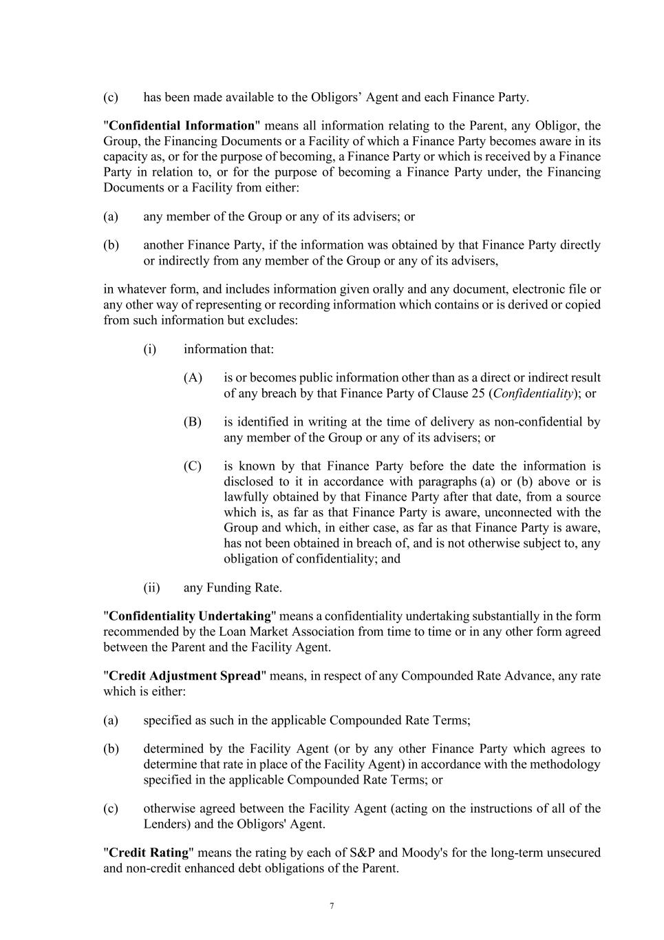 7 (c) has been made available to the Obligors’ Agent and each Finance Party. "Confidential Information" means all information relating to the Parent, any Obligor, the Group, the Financing Documents or a Facility of which a Finance Party becomes aware in its capacity as, or for the purpose of becoming, a Finance Party or which is received by a Finance Party in relation to, or for the purpose of becoming a Finance Party under, the Financing Documents or a Facility from either: (a) any member of the Group or any of its advisers; or (b) another Finance Party, if the information was obtained by that Finance Party directly or indirectly from any member of the Group or any of its advisers, in whatever form, and includes information given orally and any document, electronic file or any other way of representing or recording information which contains or is derived or copied from such information but excludes: (i) information that: (A) is or becomes public information other than as a direct or indirect result of any breach by that Finance Party of Clause 25 (Confidentiality); or (B) is identified in writing at the time of delivery as non-confidential by any member of the Group or any of its advisers; or (C) is known by that Finance Party before the date the information is disclosed to it in accordance with paragraphs (a) or (b) above or is lawfully obtained by that Finance Party after that date, from a source which is, as far as that Finance Party is aware, unconnected with the Group and which, in either case, as far as that Finance Party is aware, has not been obtained in breach of, and is not otherwise subject to, any obligation of confidentiality; and (ii) any Funding Rate. "Confidentiality Undertaking" means a confidentiality undertaking substantially in the form recommended by the Loan Market Association from time to time or in any other form agreed between the Parent and the Facility Agent. "Credit Adjustment Spread" means, in respect of any Compounded Rate Advance, any rate which is either: (a) specified as such in the applicable Compounded Rate Terms; (b) determined by the Facility Agent (or by any other Finance Party which agrees to determine that rate in place of the Facility Agent) in accordance with the methodology specified in the applicable Compounded Rate Terms; or (c) otherwise agreed between the Facility Agent (acting on the instructions of all of the Lenders) and the Obligors' Agent. "Credit Rating" means the rating by each of S&P and Moody's for the long-term unsecured and non-credit enhanced debt obligations of the Parent.