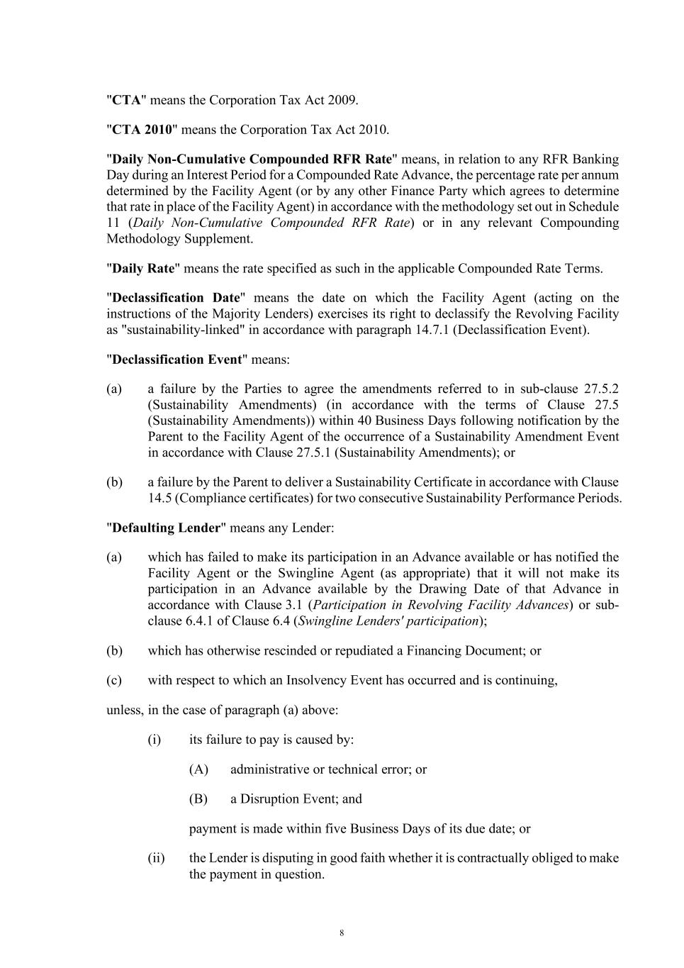 8 "CTA" means the Corporation Tax Act 2009. "CTA 2010" means the Corporation Tax Act 2010. "Daily Non-Cumulative Compounded RFR Rate" means, in relation to any RFR Banking Day during an Interest Period for a Compounded Rate Advance, the percentage rate per annum determined by the Facility Agent (or by any other Finance Party which agrees to determine that rate in place of the Facility Agent) in accordance with the methodology set out in Schedule 11 (Daily Non-Cumulative Compounded RFR Rate) or in any relevant Compounding Methodology Supplement. "Daily Rate" means the rate specified as such in the applicable Compounded Rate Terms. "Declassification Date" means the date on which the Facility Agent (acting on the instructions of the Majority Lenders) exercises its right to declassify the Revolving Facility as "sustainability-linked" in accordance with paragraph 14.7.1 (Declassification Event). "Declassification Event" means: (a) a failure by the Parties to agree the amendments referred to in sub-clause 27.5.2 (Sustainability Amendments) (in accordance with the terms of Clause 27.5 (Sustainability Amendments)) within 40 Business Days following notification by the Parent to the Facility Agent of the occurrence of a Sustainability Amendment Event in accordance with Clause 27.5.1 (Sustainability Amendments); or (b) a failure by the Parent to deliver a Sustainability Certificate in accordance with Clause 14.5 (Compliance certificates) for two consecutive Sustainability Performance Periods. "Defaulting Lender" means any Lender: (a) which has failed to make its participation in an Advance available or has notified the Facility Agent or the Swingline Agent (as appropriate) that it will not make its participation in an Advance available by the Drawing Date of that Advance in accordance with Clause 3.1 (Participation in Revolving Facility Advances) or sub- clause 6.4.1 of Clause 6.4 (Swingline Lenders' participation); (b) which has otherwise rescinded or repudiated a Financing Document; or (c) with respect to which an Insolvency Event has occurred and is continuing, unless, in the case of paragraph (a) above: (i) its failure to pay is caused by: (A) administrative or technical error; or (B) a Disruption Event; and payment is made within five Business Days of its due date; or (ii) the Lender is disputing in good faith whether it is contractually obliged to make the payment in question.
