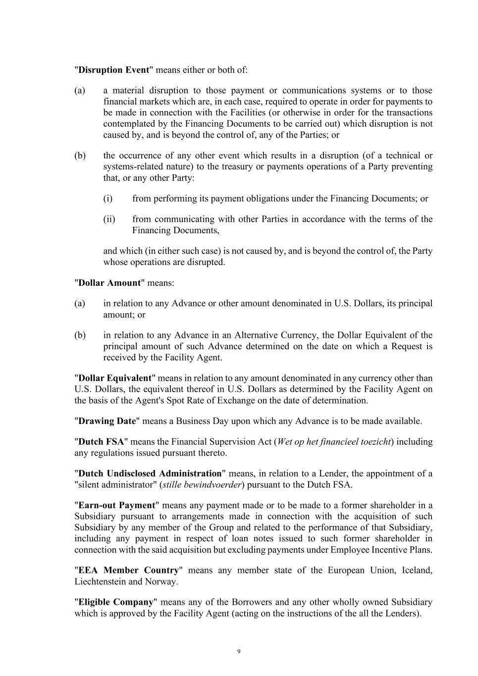 9 "Disruption Event" means either or both of: (a) a material disruption to those payment or communications systems or to those financial markets which are, in each case, required to operate in order for payments to be made in connection with the Facilities (or otherwise in order for the transactions contemplated by the Financing Documents to be carried out) which disruption is not caused by, and is beyond the control of, any of the Parties; or (b) the occurrence of any other event which results in a disruption (of a technical or systems-related nature) to the treasury or payments operations of a Party preventing that, or any other Party: (i) from performing its payment obligations under the Financing Documents; or (ii) from communicating with other Parties in accordance with the terms of the Financing Documents, and which (in either such case) is not caused by, and is beyond the control of, the Party whose operations are disrupted. "Dollar Amount" means: (a) in relation to any Advance or other amount denominated in U.S. Dollars, its principal amount; or (b) in relation to any Advance in an Alternative Currency, the Dollar Equivalent of the principal amount of such Advance determined on the date on which a Request is received by the Facility Agent. "Dollar Equivalent" means in relation to any amount denominated in any currency other than U.S. Dollars, the equivalent thereof in U.S. Dollars as determined by the Facility Agent on the basis of the Agent's Spot Rate of Exchange on the date of determination. "Drawing Date" means a Business Day upon which any Advance is to be made available. "Dutch FSA" means the Financial Supervision Act (Wet op het financieel toezicht) including any regulations issued pursuant thereto. "Dutch Undisclosed Administration" means, in relation to a Lender, the appointment of a "silent administrator" (stille bewindvoerder) pursuant to the Dutch FSA. "Earn-out Payment" means any payment made or to be made to a former shareholder in a Subsidiary pursuant to arrangements made in connection with the acquisition of such Subsidiary by any member of the Group and related to the performance of that Subsidiary, including any payment in respect of loan notes issued to such former shareholder in connection with the said acquisition but excluding payments under Employee Incentive Plans. "EEA Member Country" means any member state of the European Union, Iceland, Liechtenstein and Norway. "Eligible Company" means any of the Borrowers and any other wholly owned Subsidiary which is approved by the Facility Agent (acting on the instructions of the all the Lenders).