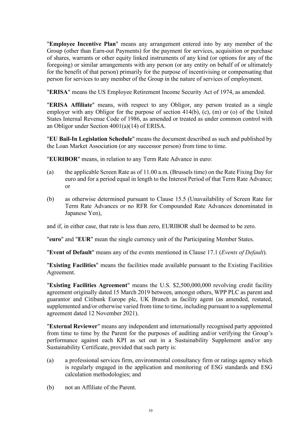 10 "Employee Incentive Plan" means any arrangement entered into by any member of the Group (other than Earn-out Payments) for the payment for services, acquisition or purchase of shares, warrants or other equity linked instruments of any kind (or options for any of the foregoing) or similar arrangements with any person (or any entity on behalf of or ultimately for the benefit of that person) primarily for the purpose of incentivising or compensating that person for services to any member of the Group in the nature of services of employment. "ERISA" means the US Employee Retirement Income Security Act of 1974, as amended. "ERISA Affiliate" means, with respect to any Obligor, any person treated as a single employer with any Obligor for the purpose of section 414(b), (c), (m) or (o) of the United States Internal Revenue Code of 1986, as amended or treated as under common control with an Obligor under Section 4001(a)(14) of ERISA. "EU Bail-In Legislation Schedule" means the document described as such and published by the Loan Market Association (or any successor person) from time to time. "EURIBOR" means, in relation to any Term Rate Advance in euro: (a) the applicable Screen Rate as of 11.00 a.m. (Brussels time) on the Rate Fixing Day for euro and for a period equal in length to the Interest Period of that Term Rate Advance; or (b) as otherwise determined pursuant to Clause 15.5 (Unavailability of Screen Rate for Term Rate Advances or no RFR for Compounded Rate Advances denominated in Japanese Yen), and if, in either case, that rate is less than zero, EURIBOR shall be deemed to be zero. "euro" and "EUR" mean the single currency unit of the Participating Member States. "Event of Default" means any of the events mentioned in Clause 17.1 (Events of Default). "Existing Facilities" means the facilities made available pursuant to the Existing Facilities Agreement. "Existing Facilities Agreement" means the U.S. $2,500,000,000 revolving credit facility agreement originally dated 15 March 2019 between, amongst others, WPP PLC as parent and guarantor and Citibank Europe plc, UK Branch as facility agent (as amended, restated, supplemented and/or otherwise varied from time to time, including pursuant to a supplemental agreement dated 12 November 2021). "External Reviewer" means any independent and internationally recognised party appointed from time to time by the Parent for the purposes of auditing and/or verifying the Group’s performance against each KPI as set out in a Sustainability Supplement and/or any Sustainability Certificate, provided that such party is: (a) a professional services firm, environmental consultancy firm or ratings agency which is regularly engaged in the application and monitoring of ESG standards and ESG calculation methodologies; and (b) not an Affiliate of the Parent.