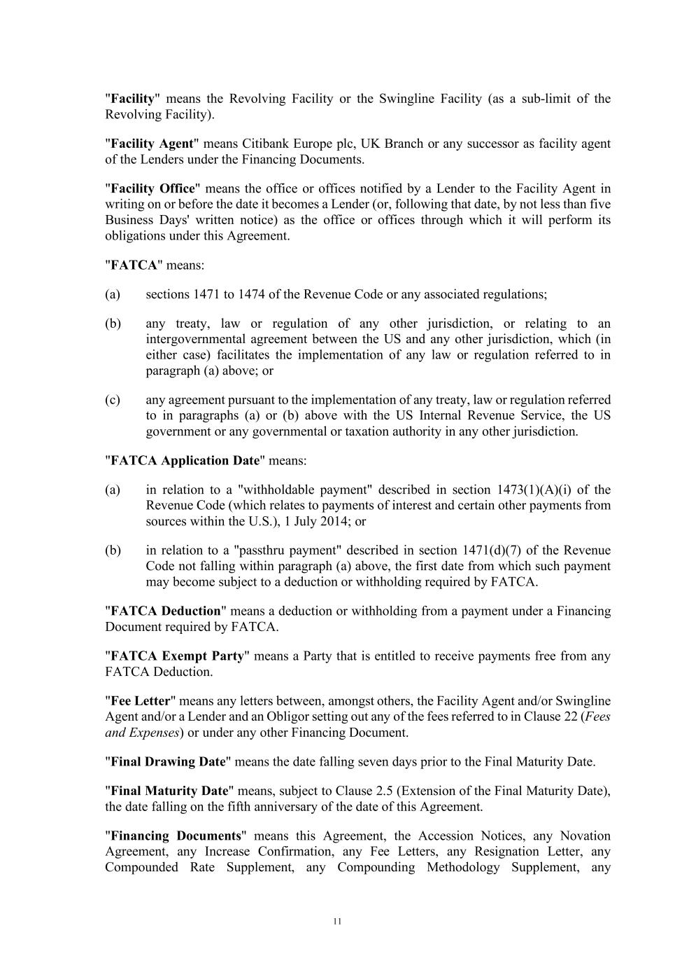 11 "Facility" means the Revolving Facility or the Swingline Facility (as a sub-limit of the Revolving Facility). "Facility Agent" means Citibank Europe plc, UK Branch or any successor as facility agent of the Lenders under the Financing Documents. "Facility Office" means the office or offices notified by a Lender to the Facility Agent in writing on or before the date it becomes a Lender (or, following that date, by not less than five Business Days' written notice) as the office or offices through which it will perform its obligations under this Agreement. "FATCA" means: (a) sections 1471 to 1474 of the Revenue Code or any associated regulations; (b) any treaty, law or regulation of any other jurisdiction, or relating to an intergovernmental agreement between the US and any other jurisdiction, which (in either case) facilitates the implementation of any law or regulation referred to in paragraph (a) above; or (c) any agreement pursuant to the implementation of any treaty, law or regulation referred to in paragraphs (a) or (b) above with the US Internal Revenue Service, the US government or any governmental or taxation authority in any other jurisdiction. "FATCA Application Date" means: (a) in relation to a "withholdable payment" described in section 1473(1)(A)(i) of the Revenue Code (which relates to payments of interest and certain other payments from sources within the U.S.), 1 July 2014; or (b) in relation to a "passthru payment" described in section 1471(d)(7) of the Revenue Code not falling within paragraph (a) above, the first date from which such payment may become subject to a deduction or withholding required by FATCA. "FATCA Deduction" means a deduction or withholding from a payment under a Financing Document required by FATCA. "FATCA Exempt Party" means a Party that is entitled to receive payments free from any FATCA Deduction. "Fee Letter" means any letters between, amongst others, the Facility Agent and/or Swingline Agent and/or a Lender and an Obligor setting out any of the fees referred to in Clause 22 (Fees and Expenses) or under any other Financing Document. "Final Drawing Date" means the date falling seven days prior to the Final Maturity Date. "Final Maturity Date" means, subject to Clause 2.5 (Extension of the Final Maturity Date), the date falling on the fifth anniversary of the date of this Agreement. "Financing Documents" means this Agreement, the Accession Notices, any Novation Agreement, any Increase Confirmation, any Fee Letters, any Resignation Letter, any Compounded Rate Supplement, any Compounding Methodology Supplement, any