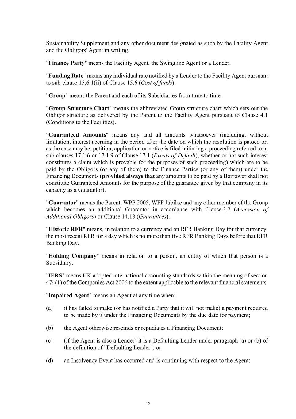 12 Sustainability Supplement and any other document designated as such by the Facility Agent and the Obligors' Agent in writing. "Finance Party" means the Facility Agent, the Swingline Agent or a Lender. "Funding Rate" means any individual rate notified by a Lender to the Facility Agent pursuant to sub-clause 15.6.1(ii) of Clause 15.6 (Cost of funds). "Group" means the Parent and each of its Subsidiaries from time to time. "Group Structure Chart" means the abbreviated Group structure chart which sets out the Obligor structure as delivered by the Parent to the Facility Agent pursuant to Clause 4.1 (Conditions to the Facilities). "Guaranteed Amounts" means any and all amounts whatsoever (including, without limitation, interest accruing in the period after the date on which the resolution is passed or, as the case may be, petition, application or notice is filed initiating a proceeding referred to in sub-clauses 17.1.6 or 17.1.9 of Clause 17.1 (Events of Default), whether or not such interest constitutes a claim which is provable for the purposes of such proceeding) which are to be paid by the Obligors (or any of them) to the Finance Parties (or any of them) under the Financing Documents (provided always that any amounts to be paid by a Borrower shall not constitute Guaranteed Amounts for the purpose of the guarantee given by that company in its capacity as a Guarantor). "Guarantor" means the Parent, WPP 2005, WPP Jubilee and any other member of the Group which becomes an additional Guarantor in accordance with Clause 3.7 (Accession of Additional Obligors) or Clause 14.18 (Guarantees). "Historic RFR" means, in relation to a currency and an RFR Banking Day for that currency, the most recent RFR for a day which is no more than five RFR Banking Days before that RFR Banking Day. "Holding Company" means in relation to a person, an entity of which that person is a Subsidiary. "IFRS" means UK adopted international accounting standards within the meaning of section 474(1) of the Companies Act 2006 to the extent applicable to the relevant financial statements. "Impaired Agent" means an Agent at any time when: (a) it has failed to make (or has notified a Party that it will not make) a payment required to be made by it under the Financing Documents by the due date for payment; (b) the Agent otherwise rescinds or repudiates a Financing Document; (c) (if the Agent is also a Lender) it is a Defaulting Lender under paragraph (a) or (b) of the definition of "Defaulting Lender"; or (d) an Insolvency Event has occurred and is continuing with respect to the Agent;
