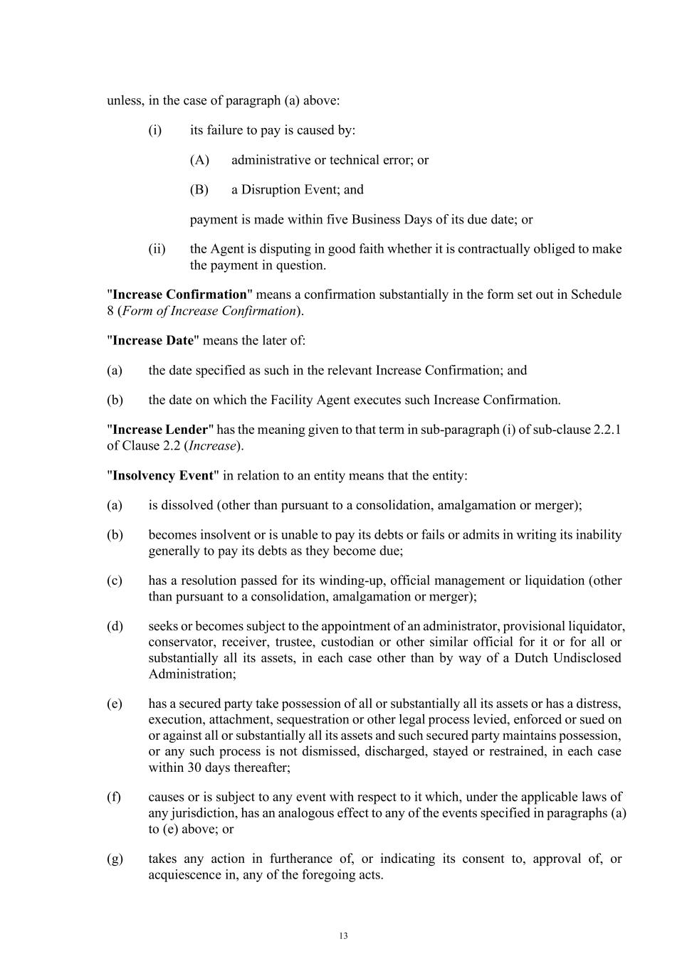 13 unless, in the case of paragraph (a) above: (i) its failure to pay is caused by: (A) administrative or technical error; or (B) a Disruption Event; and payment is made within five Business Days of its due date; or (ii) the Agent is disputing in good faith whether it is contractually obliged to make the payment in question. "Increase Confirmation" means a confirmation substantially in the form set out in Schedule 8 (Form of Increase Confirmation). "Increase Date" means the later of: (a) the date specified as such in the relevant Increase Confirmation; and (b) the date on which the Facility Agent executes such Increase Confirmation. "Increase Lender" has the meaning given to that term in sub-paragraph (i) of sub-clause 2.2.1 of Clause 2.2 (Increase). "Insolvency Event" in relation to an entity means that the entity: (a) is dissolved (other than pursuant to a consolidation, amalgamation or merger); (b) becomes insolvent or is unable to pay its debts or fails or admits in writing its inability generally to pay its debts as they become due; (c) has a resolution passed for its winding-up, official management or liquidation (other than pursuant to a consolidation, amalgamation or merger); (d) seeks or becomes subject to the appointment of an administrator, provisional liquidator, conservator, receiver, trustee, custodian or other similar official for it or for all or substantially all its assets, in each case other than by way of a Dutch Undisclosed Administration; (e) has a secured party take possession of all or substantially all its assets or has a distress, execution, attachment, sequestration or other legal process levied, enforced or sued on or against all or substantially all its assets and such secured party maintains possession, or any such process is not dismissed, discharged, stayed or restrained, in each case within 30 days thereafter; (f) causes or is subject to any event with respect to it which, under the applicable laws of any jurisdiction, has an analogous effect to any of the events specified in paragraphs (a) to (e) above; or (g) takes any action in furtherance of, or indicating its consent to, approval of, or acquiescence in, any of the foregoing acts.