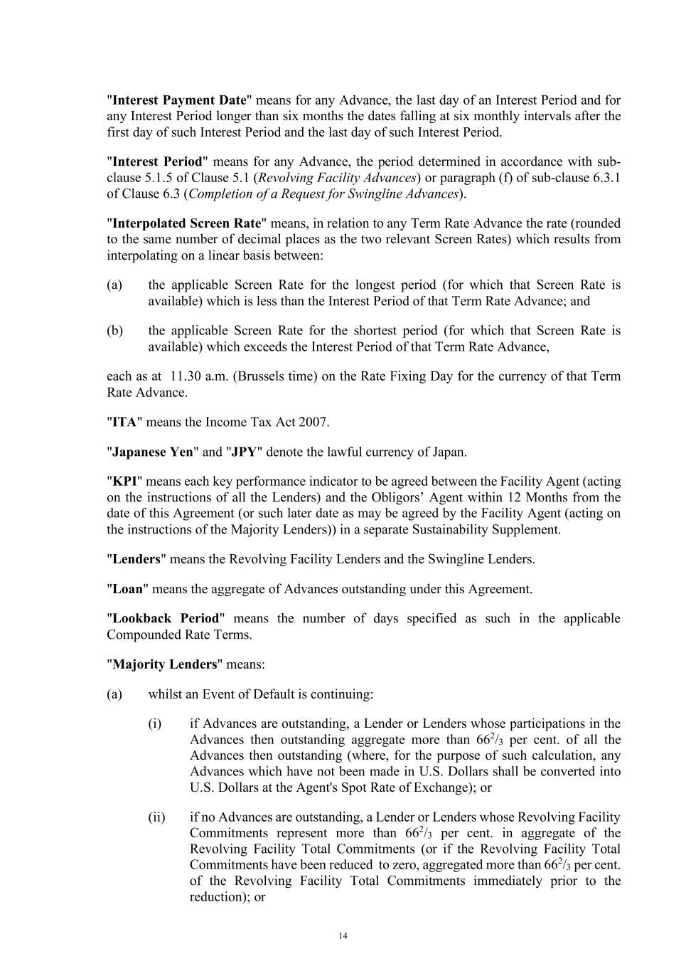 14 "Interest Payment Date" means for any Advance, the last day of an Interest Period and for any Interest Period longer than six months the dates falling at six monthly intervals after the first day of such Interest Period and the last day of such Interest Period. "Interest Period" means for any Advance, the period determined in accordance with sub- clause 5.1.5 of Clause 5.1 (Revolving Facility Advances) or paragraph (f) of sub-clause 6.3.1 of Clause 6.3 (Completion of a Request for Swingline Advances). "Interpolated Screen Rate" means, in relation to any Term Rate Advance the rate (rounded to the same number of decimal places as the two relevant Screen Rates) which results from interpolating on a linear basis between: (a) the applicable Screen Rate for the longest period (for which that Screen Rate is available) which is less than the Interest Period of that Term Rate Advance; and (b) the applicable Screen Rate for the shortest period (for which that Screen Rate is available) which exceeds the Interest Period of that Term Rate Advance, each as at 11.30 a.m. (Brussels time) on the Rate Fixing Day for the currency of that Term Rate Advance. "ITA" means the Income Tax Act 2007. "Japanese Yen" and "JPY" denote the lawful currency of Japan. "KPI" means each key performance indicator to be agreed between the Facility Agent (acting on the instructions of all the Lenders) and the Obligors’ Agent within 12 Months from the date of this Agreement (or such later date as may be agreed by the Facility Agent (acting on the instructions of the Majority Lenders)) in a separate Sustainability Supplement. "Lenders" means the Revolving Facility Lenders and the Swingline Lenders. "Loan" means the aggregate of Advances outstanding under this Agreement. "Lookback Period" means the number of days specified as such in the applicable Compounded Rate Terms. "Majority Lenders" means: (a) whilst an Event of Default is continuing: (i) if Advances are outstanding, a Lender or Lenders whose participations in the Advances then outstanding aggregate more than 662/3 per cent. of all the Advances then outstanding (where, for the purpose of such calculation, any Advances which have not been made in U.S. Dollars shall be converted into U.S. Dollars at the Agent's Spot Rate of Exchange); or (ii) if no Advances are outstanding, a Lender or Lenders whose Revolving Facility Commitments represent more than 662/3 per cent. in aggregate of the Revolving Facility Total Commitments (or if the Revolving Facility Total Commitments have been reduced to zero, aggregated more than 662/3 per cent. of the Revolving Facility Total Commitments immediately prior to the reduction); or