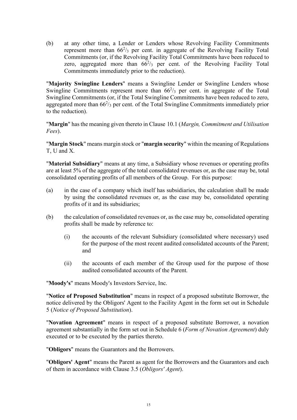15 (b) at any other time, a Lender or Lenders whose Revolving Facility Commitments represent more than 662/3 per cent. in aggregate of the Revolving Facility Total Commitments (or, if the Revolving Facility Total Commitments have been reduced to zero, aggregated more than 662/3 per cent. of the Revolving Facility Total Commitments immediately prior to the reduction). "Majority Swingline Lenders" means a Swingline Lender or Swingline Lenders whose Swingline Commitments represent more than 662/3 per cent. in aggregate of the Total Swingline Commitments (or, if the Total Swingline Commitments have been reduced to zero, aggregated more than 662/3 per cent. of the Total Swingline Commitments immediately prior to the reduction). "Margin" has the meaning given thereto in Clause 10.1 (Margin, Commitment and Utilisation Fees). "Margin Stock" means margin stock or "margin security" within the meaning of Regulations T, U and X. "Material Subsidiary" means at any time, a Subsidiary whose revenues or operating profits are at least 5% of the aggregate of the total consolidated revenues or, as the case may be, total consolidated operating profits of all members of the Group. For this purpose: (a) in the case of a company which itself has subsidiaries, the calculation shall be made by using the consolidated revenues or, as the case may be, consolidated operating profits of it and its subsidiaries; (b) the calculation of consolidated revenues or, as the case may be, consolidated operating profits shall be made by reference to: (i) the accounts of the relevant Subsidiary (consolidated where necessary) used for the purpose of the most recent audited consolidated accounts of the Parent; and (ii) the accounts of each member of the Group used for the purpose of those audited consolidated accounts of the Parent. "Moody's" means Moody's Investors Service, Inc. "Notice of Proposed Substitution" means in respect of a proposed substitute Borrower, the notice delivered by the Obligors' Agent to the Facility Agent in the form set out in Schedule 5 (Notice of Proposed Substitution). "Novation Agreement" means in respect of a proposed substitute Borrower, a novation agreement substantially in the form set out in Schedule 6 (Form of Novation Agreement) duly executed or to be executed by the parties thereto. "Obligors" means the Guarantors and the Borrowers. "Obligors' Agent" means the Parent as agent for the Borrowers and the Guarantors and each of them in accordance with Clause 3.5 (Obligors' Agent).