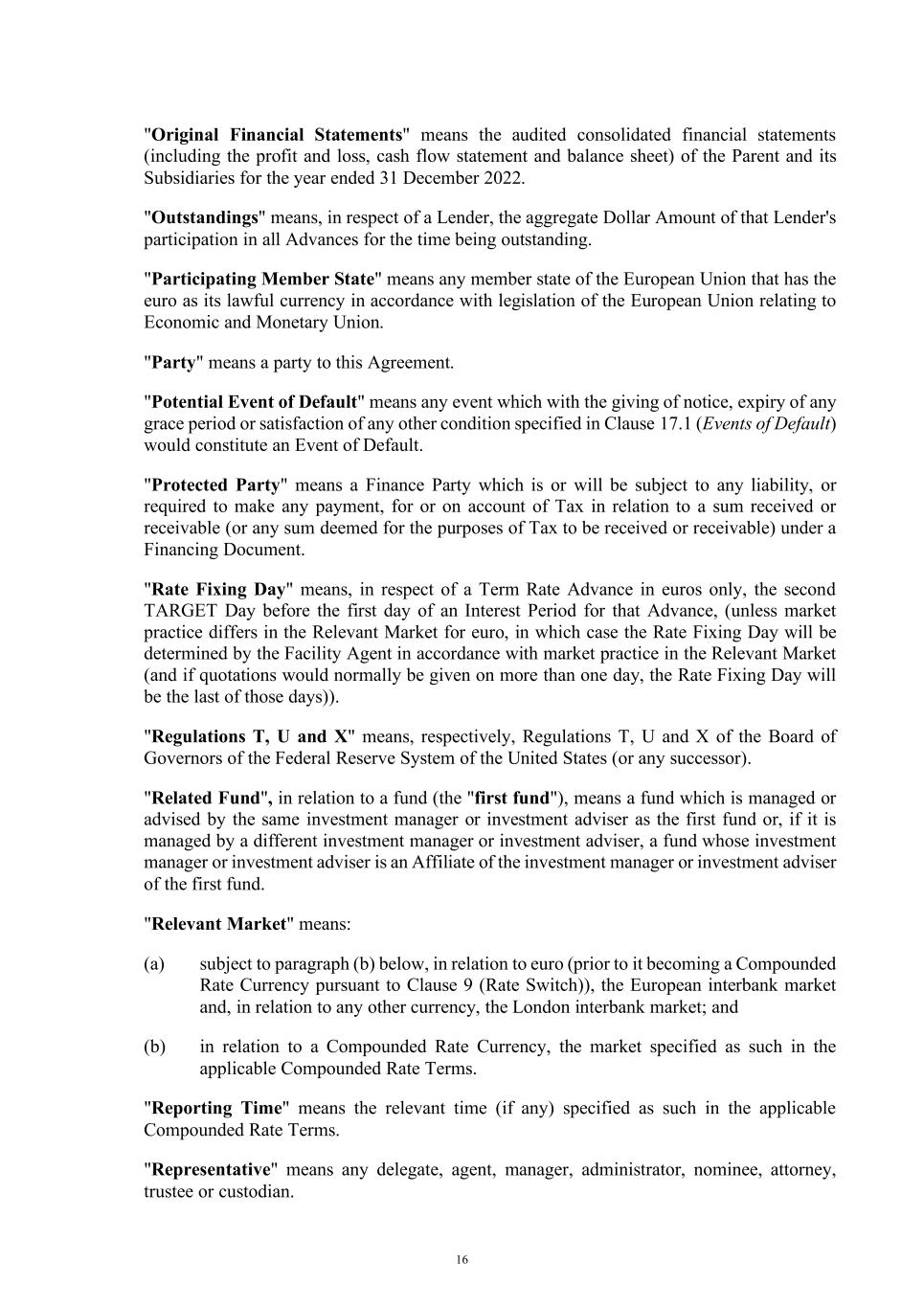 16 "Original Financial Statements" means the audited consolidated financial statements (including the profit and loss, cash flow statement and balance sheet) of the Parent and its Subsidiaries for the year ended 31 December 2022. "Outstandings" means, in respect of a Lender, the aggregate Dollar Amount of that Lender's participation in all Advances for the time being outstanding. "Participating Member State" means any member state of the European Union that has the euro as its lawful currency in accordance with legislation of the European Union relating to Economic and Monetary Union. "Party" means a party to this Agreement. "Potential Event of Default" means any event which with the giving of notice, expiry of any grace period or satisfaction of any other condition specified in Clause 17.1 (Events of Default) would constitute an Event of Default. "Protected Party" means a Finance Party which is or will be subject to any liability, or required to make any payment, for or on account of Tax in relation to a sum received or receivable (or any sum deemed for the purposes of Tax to be received or receivable) under a Financing Document. "Rate Fixing Day" means, in respect of a Term Rate Advance in euros only, the second TARGET Day before the first day of an Interest Period for that Advance, (unless market practice differs in the Relevant Market for euro, in which case the Rate Fixing Day will be determined by the Facility Agent in accordance with market practice in the Relevant Market (and if quotations would normally be given on more than one day, the Rate Fixing Day will be the last of those days)). "Regulations T, U and X" means, respectively, Regulations T, U and X of the Board of Governors of the Federal Reserve System of the United States (or any successor). "Related Fund", in relation to a fund (the "first fund"), means a fund which is managed or advised by the same investment manager or investment adviser as the first fund or, if it is managed by a different investment manager or investment adviser, a fund whose investment manager or investment adviser is an Affiliate of the investment manager or investment adviser of the first fund. "Relevant Market" means: (a) subject to paragraph (b) below, in relation to euro (prior to it becoming a Compounded Rate Currency pursuant to Clause 9 (Rate Switch)), the European interbank market and, in relation to any other currency, the London interbank market; and (b) in relation to a Compounded Rate Currency, the market specified as such in the applicable Compounded Rate Terms. "Reporting Time" means the relevant time (if any) specified as such in the applicable Compounded Rate Terms. "Representative" means any delegate, agent, manager, administrator, nominee, attorney, trustee or custodian.