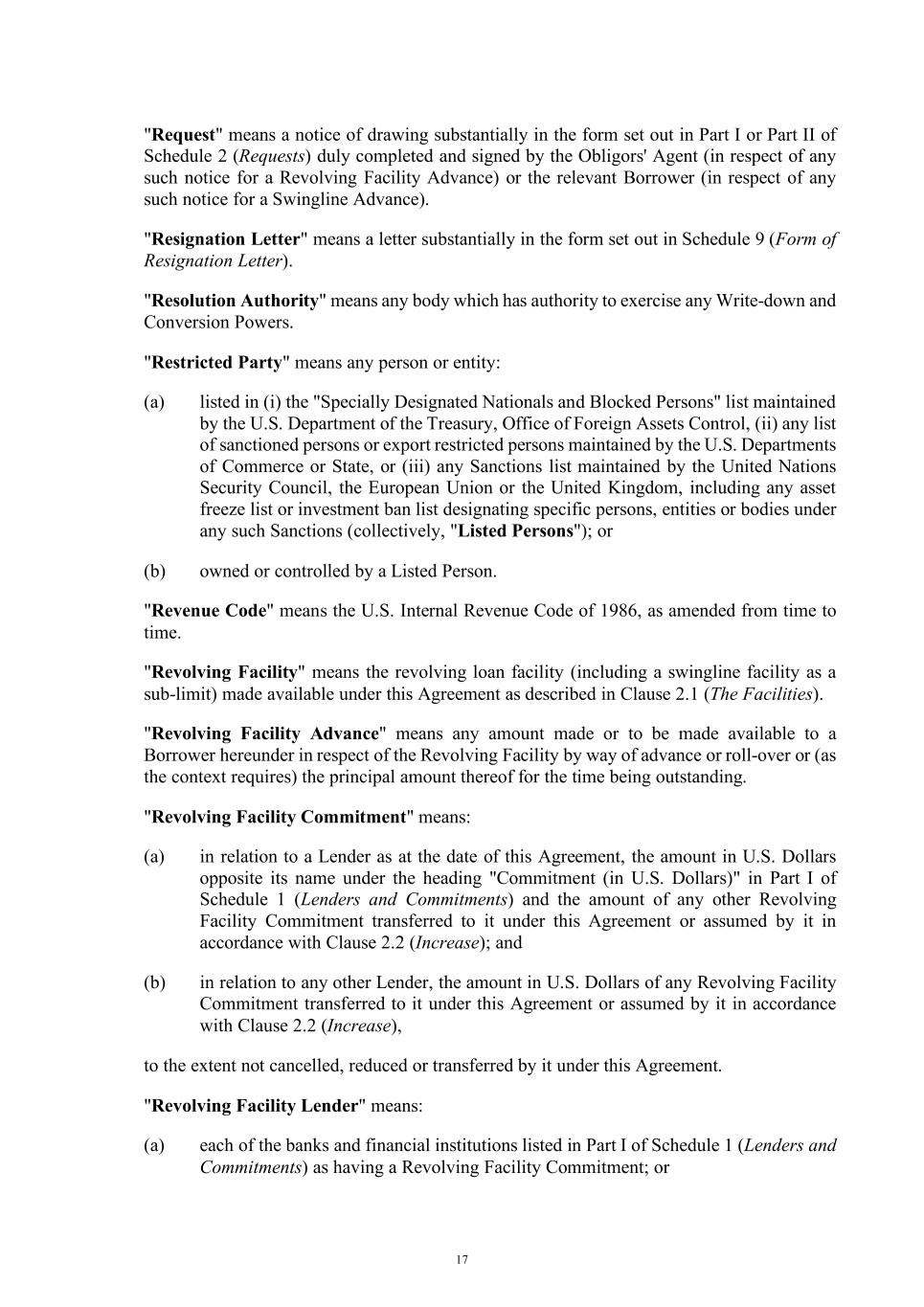 17 "Request" means a notice of drawing substantially in the form set out in Part I or Part II of Schedule 2 (Requests) duly completed and signed by the Obligors' Agent (in respect of any such notice for a Revolving Facility Advance) or the relevant Borrower (in respect of any such notice for a Swingline Advance). "Resignation Letter" means a letter substantially in the form set out in Schedule 9 (Form of Resignation Letter). "Resolution Authority" means any body which has authority to exercise any Write-down and Conversion Powers. "Restricted Party" means any person or entity: (a) listed in (i) the "Specially Designated Nationals and Blocked Persons" list maintained by the U.S. Department of the Treasury, Office of Foreign Assets Control, (ii) any list of sanctioned persons or export restricted persons maintained by the U.S. Departments of Commerce or State, or (iii) any Sanctions list maintained by the United Nations Security Council, the European Union or the United Kingdom, including any asset freeze list or investment ban list designating specific persons, entities or bodies under any such Sanctions (collectively, "Listed Persons"); or (b) owned or controlled by a Listed Person. "Revenue Code" means the U.S. Internal Revenue Code of 1986, as amended from time to time. "Revolving Facility" means the revolving loan facility (including a swingline facility as a sub-limit) made available under this Agreement as described in Clause 2.1 (The Facilities). "Revolving Facility Advance" means any amount made or to be made available to a Borrower hereunder in respect of the Revolving Facility by way of advance or roll-over or (as the context requires) the principal amount thereof for the time being outstanding. "Revolving Facility Commitment" means: (a) in relation to a Lender as at the date of this Agreement, the amount in U.S. Dollars opposite its name under the heading "Commitment (in U.S. Dollars)" in Part I of Schedule 1 (Lenders and Commitments) and the amount of any other Revolving Facility Commitment transferred to it under this Agreement or assumed by it in accordance with Clause 2.2 (Increase); and (b) in relation to any other Lender, the amount in U.S. Dollars of any Revolving Facility Commitment transferred to it under this Agreement or assumed by it in accordance with Clause 2.2 (Increase), to the extent not cancelled, reduced or transferred by it under this Agreement. "Revolving Facility Lender" means: (a) each of the banks and financial institutions listed in Part I of Schedule 1 (Lenders and Commitments) as having a Revolving Facility Commitment; or