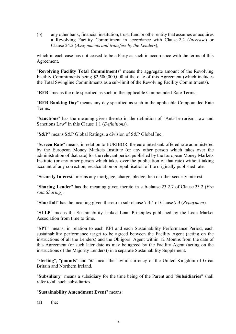 18 (b) any other bank, financial institution, trust, fund or other entity that assumes or acquires a Revolving Facility Commitment in accordance with Clause 2.2 (Increase) or Clause 24.2 (Assignments and transfers by the Lenders), which in each case has not ceased to be a Party as such in accordance with the terms of this Agreement. "Revolving Facility Total Commitments" means the aggregate amount of the Revolving Facility Commitments being $2,500,000,000 at the date of this Agreement (which includes the Total Swingline Commitments as a sub-limit of the Revolving Facility Commitments). "RFR" means the rate specified as such in the applicable Compounded Rate Terms. "RFR Banking Day" means any day specified as such in the applicable Compounded Rate Terms. "Sanctions" has the meaning given thereto in the definition of "Anti-Terrorism Law and Sanctions Law" in this Clause 1.1 (Definitions). "S&P" means S&P Global Ratings, a division of S&P Global Inc.. "Screen Rate" means, in relation to EURIBOR, the euro interbank offered rate administered by the European Money Markets Institute (or any other person which takes over the administration of that rate) for the relevant period published by the European Money Markets Institute (or any other person which takes over the publication of that rate) without taking account of any correction, recalculation or republication of the originally published rate. "Security Interest" means any mortgage, charge, pledge, lien or other security interest. "Sharing Lender" has the meaning given thereto in sub-clause 23.2.7 of Clause 23.2 (Pro rata Sharing). "Shortfall" has the meaning given thereto in sub-clause 7.3.4 of Clause 7.3 (Repayment). "SLLP" means the Sustainability-Linked Loan Principles published by the Loan Market Association from time to time. "SPT" means, in relation to each KPI and each Sustainability Performance Period, each sustainability performance target to be agreed between the Facility Agent (acting on the instructions of all the Lenders) and the Obligors’ Agent within 12 Months from the date of this Agreement (or such later date as may be agreed by the Facility Agent (acting on the instructions of the Majority Lenders)) in a separate Sustainability Supplement. "sterling", "pounds" and "£" mean the lawful currency of the United Kingdom of Great Britain and Northern Ireland. "Subsidiary" means a subsidiary for the time being of the Parent and "Subsidiaries" shall refer to all such subsidiaries. "Sustainability Amendment Event" means: (a) the:
