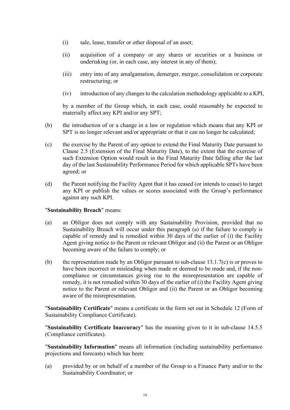 19 (i) sale, lease, transfer or other disposal of an asset; (ii) acquisition of a company or any shares or securities or a business or undertaking (or, in each case, any interest in any of them); (iii) entry into of any amalgamation, demerger, merger, consolidation or corporate restructuring; or (iv) introduction of any changes to the calculation methodology applicable to a KPI, by a member of the Group which, in each case, could reasonably be expected to materially affect any KPI and/or any SPT; (b) the introduction of or a change in a law or regulation which means that any KPI or SPT is no longer relevant and/or appropriate or that it can no longer be calculated; (c) the exercise by the Parent of any option to extend the Final Maturity Date pursuant to Clause 2.5 (Extension of the Final Maturity Date), to the extent that the exercise of such Extension Option would result in the Final Maturity Date falling after the last day of the last Sustainability Performance Period for which applicable SPTs have been agreed; or (d) the Parent notifying the Facility Agent that it has ceased (or intends to cease) to target any KPI or publish the values or scores associated with the Group’s performance against any such KPI. "Sustainability Breach" means: (a) an Obligor does not comply with any Sustainability Provision, provided that no Sustainability Breach will occur under this paragraph (a) if the failure to comply is capable of remedy and is remedied within 30 days of the earlier of (i) the Facility Agent giving notice to the Parent or relevant Obligor and (ii) the Parent or an Obligor becoming aware of the failure to comply; or (b) the representation made by an Obligor pursuant to sub-clause 13.1.7(c) is or proves to have been incorrect or misleading when made or deemed to be made and, if the non- compliance or circumstances giving rise to the misrepresentation are capable of remedy, it is not remedied within 30 days of the earlier of (i) the Facility Agent giving notice to the Parent or relevant Obligor and (ii) the Parent or an Obligor becoming aware of the misrepresentation. "Sustainability Certificate" means a certificate in the form set out in Schedule 12 (Form of Sustainability Compliance Certificate). "Sustainability Certificate Inaccuracy" has the meaning given to it in sub-clause 14.5.5 (Compliance certificates). "Sustainability Information" means all information (including sustainability performance projections and forecasts) which has been: (a) provided by or on behalf of a member of the Group to a Finance Party and/or to the Sustainability Coordinator; or