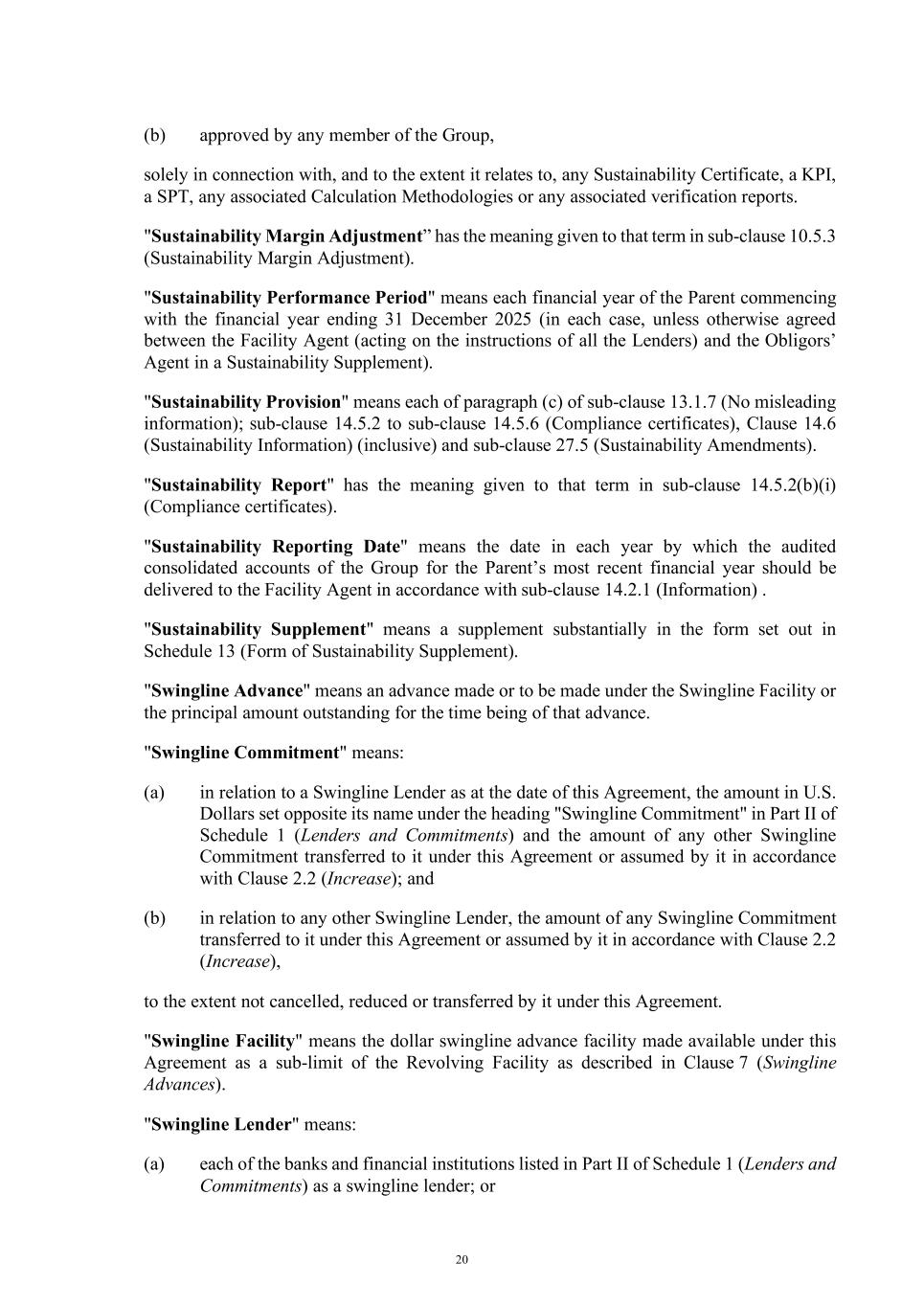 20 (b) approved by any member of the Group, solely in connection with, and to the extent it relates to, any Sustainability Certificate, a KPI, a SPT, any associated Calculation Methodologies or any associated verification reports. "Sustainability Margin Adjustment” has the meaning given to that term in sub-clause 10.5.3 (Sustainability Margin Adjustment). "Sustainability Performance Period" means each financial year of the Parent commencing with the financial year ending 31 December 2025 (in each case, unless otherwise agreed between the Facility Agent (acting on the instructions of all the Lenders) and the Obligors’ Agent in a Sustainability Supplement). "Sustainability Provision" means each of paragraph (c) of sub-clause 13.1.7 (No misleading information); sub-clause 14.5.2 to sub-clause 14.5.6 (Compliance certificates), Clause 14.6 (Sustainability Information) (inclusive) and sub-clause 27.5 (Sustainability Amendments). "Sustainability Report" has the meaning given to that term in sub-clause 14.5.2(b)(i) (Compliance certificates). "Sustainability Reporting Date" means the date in each year by which the audited consolidated accounts of the Group for the Parent’s most recent financial year should be delivered to the Facility Agent in accordance with sub-clause 14.2.1 (Information) . "Sustainability Supplement" means a supplement substantially in the form set out in Schedule 13 (Form of Sustainability Supplement). "Swingline Advance" means an advance made or to be made under the Swingline Facility or the principal amount outstanding for the time being of that advance. "Swingline Commitment" means: (a) in relation to a Swingline Lender as at the date of this Agreement, the amount in U.S. Dollars set opposite its name under the heading "Swingline Commitment" in Part II of Schedule 1 (Lenders and Commitments) and the amount of any other Swingline Commitment transferred to it under this Agreement or assumed by it in accordance with Clause 2.2 (Increase); and (b) in relation to any other Swingline Lender, the amount of any Swingline Commitment transferred to it under this Agreement or assumed by it in accordance with Clause 2.2 (Increase), to the extent not cancelled, reduced or transferred by it under this Agreement. "Swingline Facility" means the dollar swingline advance facility made available under this Agreement as a sub-limit of the Revolving Facility as described in Clause 7 (Swingline Advances). "Swingline Lender" means: (a) each of the banks and financial institutions listed in Part II of Schedule 1 (Lenders and Commitments) as a swingline lender; or