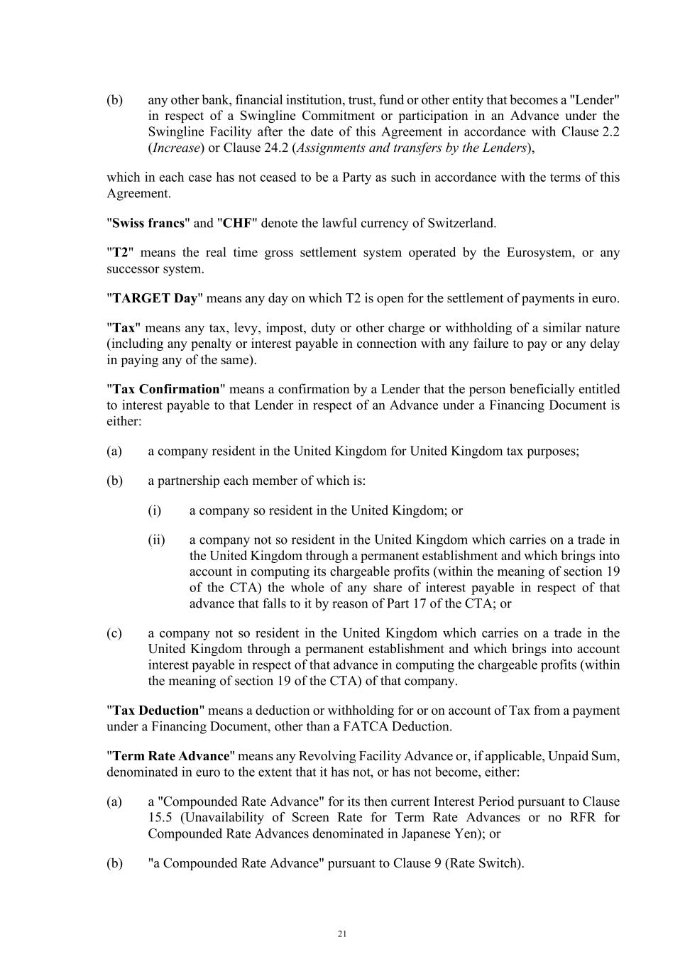 21 (b) any other bank, financial institution, trust, fund or other entity that becomes a "Lender" in respect of a Swingline Commitment or participation in an Advance under the Swingline Facility after the date of this Agreement in accordance with Clause 2.2 (Increase) or Clause 24.2 (Assignments and transfers by the Lenders), which in each case has not ceased to be a Party as such in accordance with the terms of this Agreement. "Swiss francs" and "CHF" denote the lawful currency of Switzerland. "T2" means the real time gross settlement system operated by the Eurosystem, or any successor system. "TARGET Day" means any day on which T2 is open for the settlement of payments in euro. "Tax" means any tax, levy, impost, duty or other charge or withholding of a similar nature (including any penalty or interest payable in connection with any failure to pay or any delay in paying any of the same). "Tax Confirmation" means a confirmation by a Lender that the person beneficially entitled to interest payable to that Lender in respect of an Advance under a Financing Document is either: (a) a company resident in the United Kingdom for United Kingdom tax purposes; (b) a partnership each member of which is: (i) a company so resident in the United Kingdom; or (ii) a company not so resident in the United Kingdom which carries on a trade in the United Kingdom through a permanent establishment and which brings into account in computing its chargeable profits (within the meaning of section 19 of the CTA) the whole of any share of interest payable in respect of that advance that falls to it by reason of Part 17 of the CTA; or (c) a company not so resident in the United Kingdom which carries on a trade in the United Kingdom through a permanent establishment and which brings into account interest payable in respect of that advance in computing the chargeable profits (within the meaning of section 19 of the CTA) of that company. "Tax Deduction" means a deduction or withholding for or on account of Tax from a payment under a Financing Document, other than a FATCA Deduction. "Term Rate Advance" means any Revolving Facility Advance or, if applicable, Unpaid Sum, denominated in euro to the extent that it has not, or has not become, either: (a) a "Compounded Rate Advance" for its then current Interest Period pursuant to Clause 15.5 (Unavailability of Screen Rate for Term Rate Advances or no RFR for Compounded Rate Advances denominated in Japanese Yen); or (b) "a Compounded Rate Advance" pursuant to Clause 9 (Rate Switch).