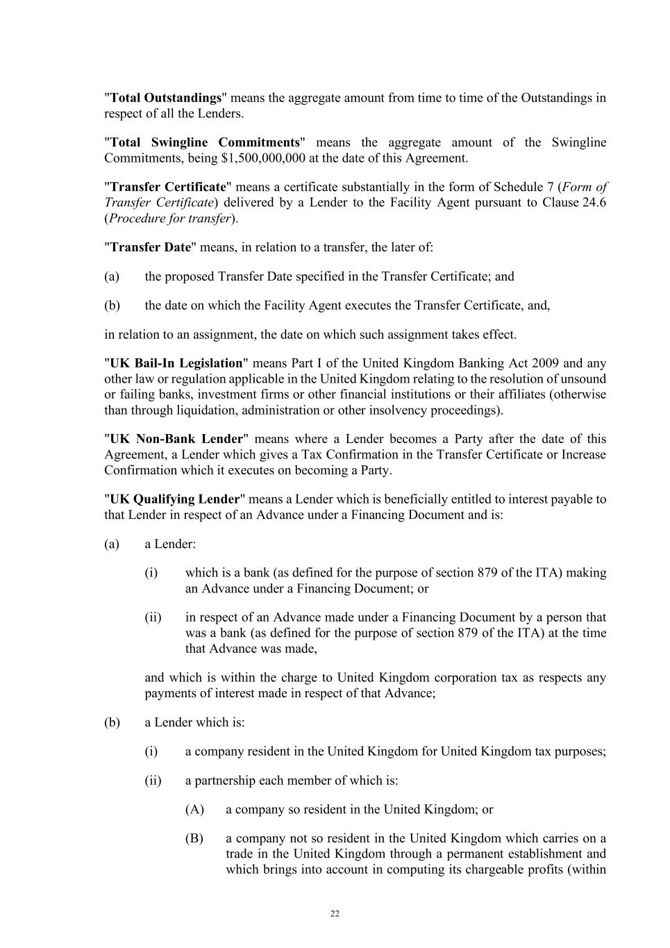 22 "Total Outstandings" means the aggregate amount from time to time of the Outstandings in respect of all the Lenders. "Total Swingline Commitments" means the aggregate amount of the Swingline Commitments, being $1,500,000,000 at the date of this Agreement. "Transfer Certificate" means a certificate substantially in the form of Schedule 7 (Form of Transfer Certificate) delivered by a Lender to the Facility Agent pursuant to Clause 24.6 (Procedure for transfer). "Transfer Date" means, in relation to a transfer, the later of: (a) the proposed Transfer Date specified in the Transfer Certificate; and (b) the date on which the Facility Agent executes the Transfer Certificate, and, in relation to an assignment, the date on which such assignment takes effect. "UK Bail-In Legislation" means Part I of the United Kingdom Banking Act 2009 and any other law or regulation applicable in the United Kingdom relating to the resolution of unsound or failing banks, investment firms or other financial institutions or their affiliates (otherwise than through liquidation, administration or other insolvency proceedings). "UK Non-Bank Lender" means where a Lender becomes a Party after the date of this Agreement, a Lender which gives a Tax Confirmation in the Transfer Certificate or Increase Confirmation which it executes on becoming a Party. "UK Qualifying Lender" means a Lender which is beneficially entitled to interest payable to that Lender in respect of an Advance under a Financing Document and is: (a) a Lender: (i) which is a bank (as defined for the purpose of section 879 of the ITA) making an Advance under a Financing Document; or (ii) in respect of an Advance made under a Financing Document by a person that was a bank (as defined for the purpose of section 879 of the ITA) at the time that Advance was made, and which is within the charge to United Kingdom corporation tax as respects any payments of interest made in respect of that Advance; (b) a Lender which is: (i) a company resident in the United Kingdom for United Kingdom tax purposes; (ii) a partnership each member of which is: (A) a company so resident in the United Kingdom; or (B) a company not so resident in the United Kingdom which carries on a trade in the United Kingdom through a permanent establishment and which brings into account in computing its chargeable profits (within