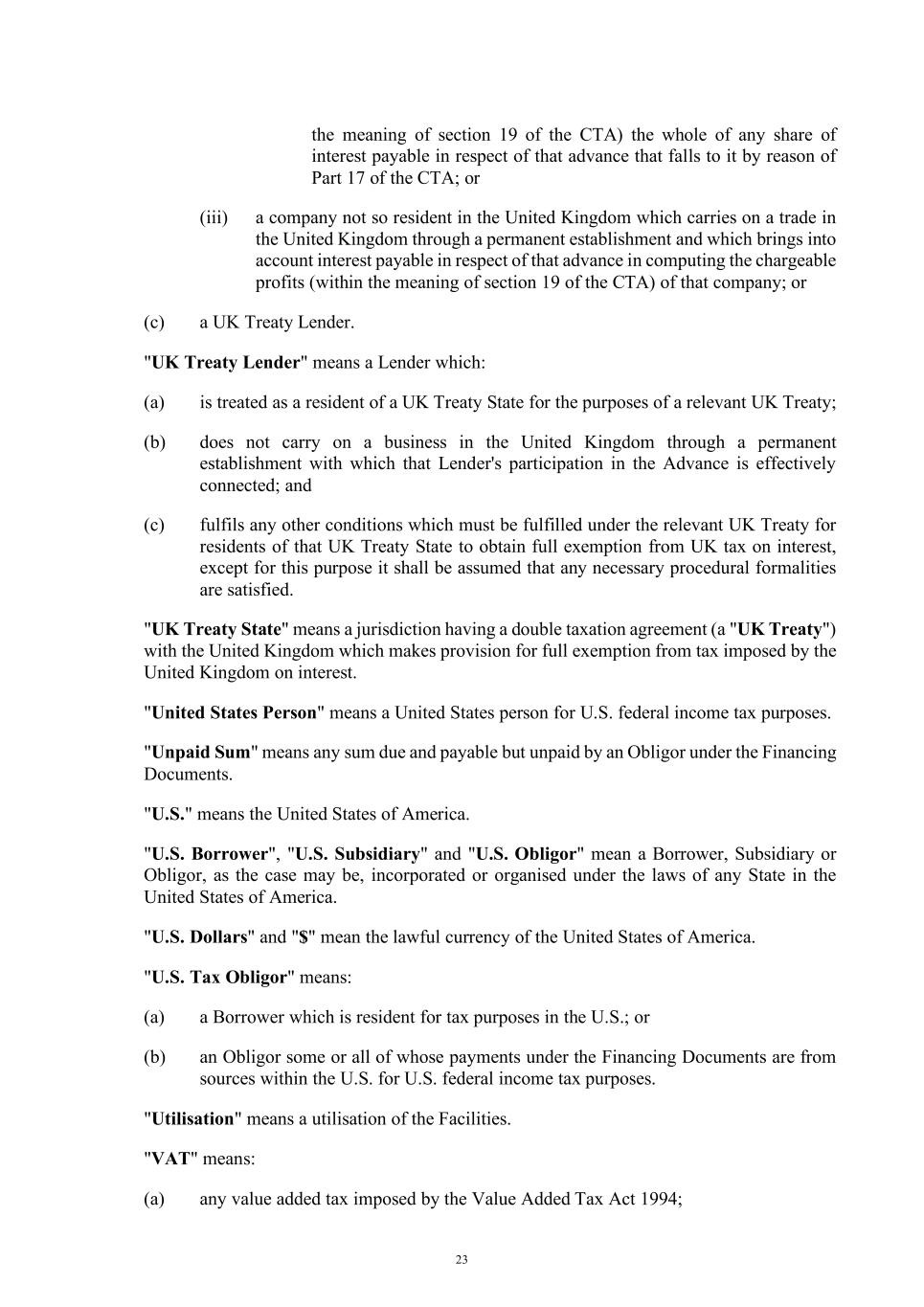 23 the meaning of section 19 of the CTA) the whole of any share of interest payable in respect of that advance that falls to it by reason of Part 17 of the CTA; or (iii) a company not so resident in the United Kingdom which carries on a trade in the United Kingdom through a permanent establishment and which brings into account interest payable in respect of that advance in computing the chargeable profits (within the meaning of section 19 of the CTA) of that company; or (c) a UK Treaty Lender. "UK Treaty Lender" means a Lender which: (a) is treated as a resident of a UK Treaty State for the purposes of a relevant UK Treaty; (b) does not carry on a business in the United Kingdom through a permanent establishment with which that Lender's participation in the Advance is effectively connected; and (c) fulfils any other conditions which must be fulfilled under the relevant UK Treaty for residents of that UK Treaty State to obtain full exemption from UK tax on interest, except for this purpose it shall be assumed that any necessary procedural formalities are satisfied. "UK Treaty State" means a jurisdiction having a double taxation agreement (a "UK Treaty") with the United Kingdom which makes provision for full exemption from tax imposed by the United Kingdom on interest. "United States Person" means a United States person for U.S. federal income tax purposes. "Unpaid Sum" means any sum due and payable but unpaid by an Obligor under the Financing Documents. "U.S." means the United States of America. "U.S. Borrower", "U.S. Subsidiary" and "U.S. Obligor" mean a Borrower, Subsidiary or Obligor, as the case may be, incorporated or organised under the laws of any State in the United States of America. "U.S. Dollars" and "$" mean the lawful currency of the United States of America. "U.S. Tax Obligor" means: (a) a Borrower which is resident for tax purposes in the U.S.; or (b) an Obligor some or all of whose payments under the Financing Documents are from sources within the U.S. for U.S. federal income tax purposes. "Utilisation" means a utilisation of the Facilities. "VAT" means: (a) any value added tax imposed by the Value Added Tax Act 1994;