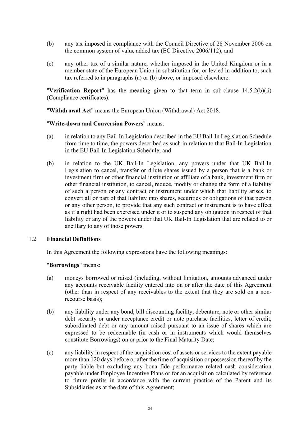 24 (b) any tax imposed in compliance with the Council Directive of 28 November 2006 on the common system of value added tax (EC Directive 2006/112); and (c) any other tax of a similar nature, whether imposed in the United Kingdom or in a member state of the European Union in substitution for, or levied in addition to, such tax referred to in paragraphs (a) or (b) above, or imposed elsewhere. "Verification Report" has the meaning given to that term in sub-clause 14.5.2(b)(ii) (Compliance certificates). "Withdrawal Act" means the European Union (Withdrawal) Act 2018. "Write-down and Conversion Powers" means: (a) in relation to any Bail-In Legislation described in the EU Bail-In Legislation Schedule from time to time, the powers described as such in relation to that Bail-In Legislation in the EU Bail-In Legislation Schedule; and (b) in relation to the UK Bail-In Legislation, any powers under that UK Bail-In Legislation to cancel, transfer or dilute shares issued by a person that is a bank or investment firm or other financial institution or affiliate of a bank, investment firm or other financial institution, to cancel, reduce, modify or change the form of a liability of such a person or any contract or instrument under which that liability arises, to convert all or part of that liability into shares, securities or obligations of that person or any other person, to provide that any such contract or instrument is to have effect as if a right had been exercised under it or to suspend any obligation in respect of that liability or any of the powers under that UK Bail-In Legislation that are related to or ancillary to any of those powers. 1.2 Financial Definitions In this Agreement the following expressions have the following meanings: "Borrowings" means: (a) moneys borrowed or raised (including, without limitation, amounts advanced under any accounts receivable facility entered into on or after the date of this Agreement (other than in respect of any receivables to the extent that they are sold on a non- recourse basis); (b) any liability under any bond, bill discounting facility, debenture, note or other similar debt security or under acceptance credit or note purchase facilities, letter of credit, subordinated debt or any amount raised pursuant to an issue of shares which are expressed to be redeemable (in cash or in instruments which would themselves constitute Borrowings) on or prior to the Final Maturity Date; (c) any liability in respect of the acquisition cost of assets or services to the extent payable more than 120 days before or after the time of acquisition or possession thereof by the party liable but excluding any bona fide performance related cash consideration payable under Employee Incentive Plans or for an acquisition calculated by reference to future profits in accordance with the current practice of the Parent and its Subsidiaries as at the date of this Agreement;