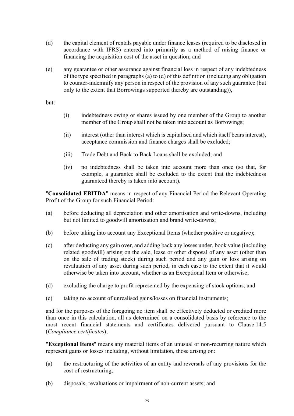 25 (d) the capital element of rentals payable under finance leases (required to be disclosed in accordance with IFRS) entered into primarily as a method of raising finance or financing the acquisition cost of the asset in question; and (e) any guarantee or other assurance against financial loss in respect of any indebtedness of the type specified in paragraphs (a) to (d) of this definition (including any obligation to counter-indemnify any person in respect of the provision of any such guarantee (but only to the extent that Borrowings supported thereby are outstanding)), but: (i) indebtedness owing or shares issued by one member of the Group to another member of the Group shall not be taken into account as Borrowings; (ii) interest (other than interest which is capitalised and which itself bears interest), acceptance commission and finance charges shall be excluded; (iii) Trade Debt and Back to Back Loans shall be excluded; and (iv) no indebtedness shall be taken into account more than once (so that, for example, a guarantee shall be excluded to the extent that the indebtedness guaranteed thereby is taken into account). "Consolidated EBITDA" means in respect of any Financial Period the Relevant Operating Profit of the Group for such Financial Period: (a) before deducting all depreciation and other amortisation and write-downs, including but not limited to goodwill amortisation and brand write-downs; (b) before taking into account any Exceptional Items (whether positive or negative); (c) after deducting any gain over, and adding back any losses under, book value (including related goodwill) arising on the sale, lease or other disposal of any asset (other than on the sale of trading stock) during such period and any gain or loss arising on revaluation of any asset during such period, in each case to the extent that it would otherwise be taken into account, whether as an Exceptional Item or otherwise; (d) excluding the charge to profit represented by the expensing of stock options; and (e) taking no account of unrealised gains/losses on financial instruments; and for the purposes of the foregoing no item shall be effectively deducted or credited more than once in this calculation, all as determined on a consolidated basis by reference to the most recent financial statements and certificates delivered pursuant to Clause 14.5 (Compliance certificates); "Exceptional Items" means any material items of an unusual or non-recurring nature which represent gains or losses including, without limitation, those arising on: (a) the restructuring of the activities of an entity and reversals of any provisions for the cost of restructuring; (b) disposals, revaluations or impairment of non-current assets; and