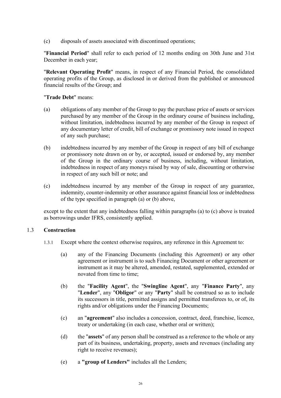 26 (c) disposals of assets associated with discontinued operations; "Financial Period" shall refer to each period of 12 months ending on 30th June and 31st December in each year; "Relevant Operating Profit" means, in respect of any Financial Period, the consolidated operating profits of the Group, as disclosed in or derived from the published or announced financial results of the Group; and "Trade Debt" means: (a) obligations of any member of the Group to pay the purchase price of assets or services purchased by any member of the Group in the ordinary course of business including, without limitation, indebtedness incurred by any member of the Group in respect of any documentary letter of credit, bill of exchange or promissory note issued in respect of any such purchase; (b) indebtedness incurred by any member of the Group in respect of any bill of exchange or promissory note drawn on or by, or accepted, issued or endorsed by, any member of the Group in the ordinary course of business, including, without limitation, indebtedness in respect of any moneys raised by way of sale, discounting or otherwise in respect of any such bill or note; and (c) indebtedness incurred by any member of the Group in respect of any guarantee, indemnity, counter-indemnity or other assurance against financial loss or indebtedness of the type specified in paragraph (a) or (b) above, except to the extent that any indebtedness falling within paragraphs (a) to (c) above is treated as borrowings under IFRS, consistently applied. 1.3 Construction 1.3.1 Except where the context otherwise requires, any reference in this Agreement to: (a) any of the Financing Documents (including this Agreement) or any other agreement or instrument is to such Financing Document or other agreement or instrument as it may be altered, amended, restated, supplemented, extended or novated from time to time; (b) the "Facility Agent", the "Swingline Agent", any "Finance Party", any "Lender", any "Obligor" or any "Party" shall be construed so as to include its successors in title, permitted assigns and permitted transferees to, or of, its rights and/or obligations under the Financing Documents; (c) an "agreement" also includes a concession, contract, deed, franchise, licence, treaty or undertaking (in each case, whether oral or written); (d) the "assets" of any person shall be construed as a reference to the whole or any part of its business, undertaking, property, assets and revenues (including any right to receive revenues); (e) a "group of Lenders" includes all the Lenders;