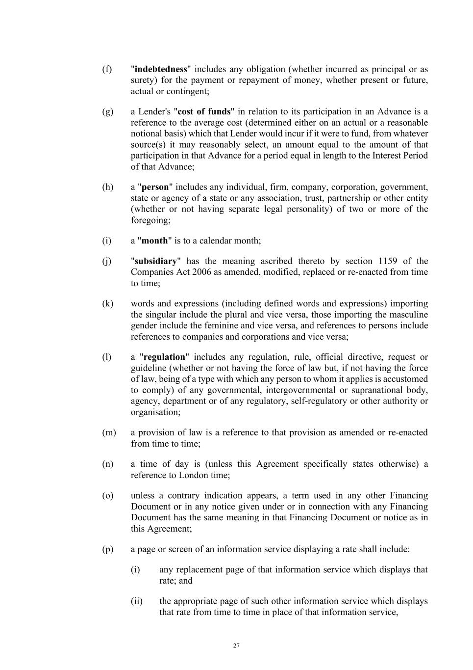 27 (f) "indebtedness" includes any obligation (whether incurred as principal or as surety) for the payment or repayment of money, whether present or future, actual or contingent; (g) a Lender's "cost of funds" in relation to its participation in an Advance is a reference to the average cost (determined either on an actual or a reasonable notional basis) which that Lender would incur if it were to fund, from whatever source(s) it may reasonably select, an amount equal to the amount of that participation in that Advance for a period equal in length to the Interest Period of that Advance; (h) a "person" includes any individual, firm, company, corporation, government, state or agency of a state or any association, trust, partnership or other entity (whether or not having separate legal personality) of two or more of the foregoing; (i) a "month" is to a calendar month; (j) "subsidiary" has the meaning ascribed thereto by section 1159 of the Companies Act 2006 as amended, modified, replaced or re-enacted from time to time; (k) words and expressions (including defined words and expressions) importing the singular include the plural and vice versa, those importing the masculine gender include the feminine and vice versa, and references to persons include references to companies and corporations and vice versa; (l) a "regulation" includes any regulation, rule, official directive, request or guideline (whether or not having the force of law but, if not having the force of law, being of a type with which any person to whom it applies is accustomed to comply) of any governmental, intergovernmental or supranational body, agency, department or of any regulatory, self-regulatory or other authority or organisation; (m) a provision of law is a reference to that provision as amended or re-enacted from time to time; (n) a time of day is (unless this Agreement specifically states otherwise) a reference to London time; (o) unless a contrary indication appears, a term used in any other Financing Document or in any notice given under or in connection with any Financing Document has the same meaning in that Financing Document or notice as in this Agreement; (p) a page or screen of an information service displaying a rate shall include: (i) any replacement page of that information service which displays that rate; and (ii) the appropriate page of such other information service which displays that rate from time to time in place of that information service,
