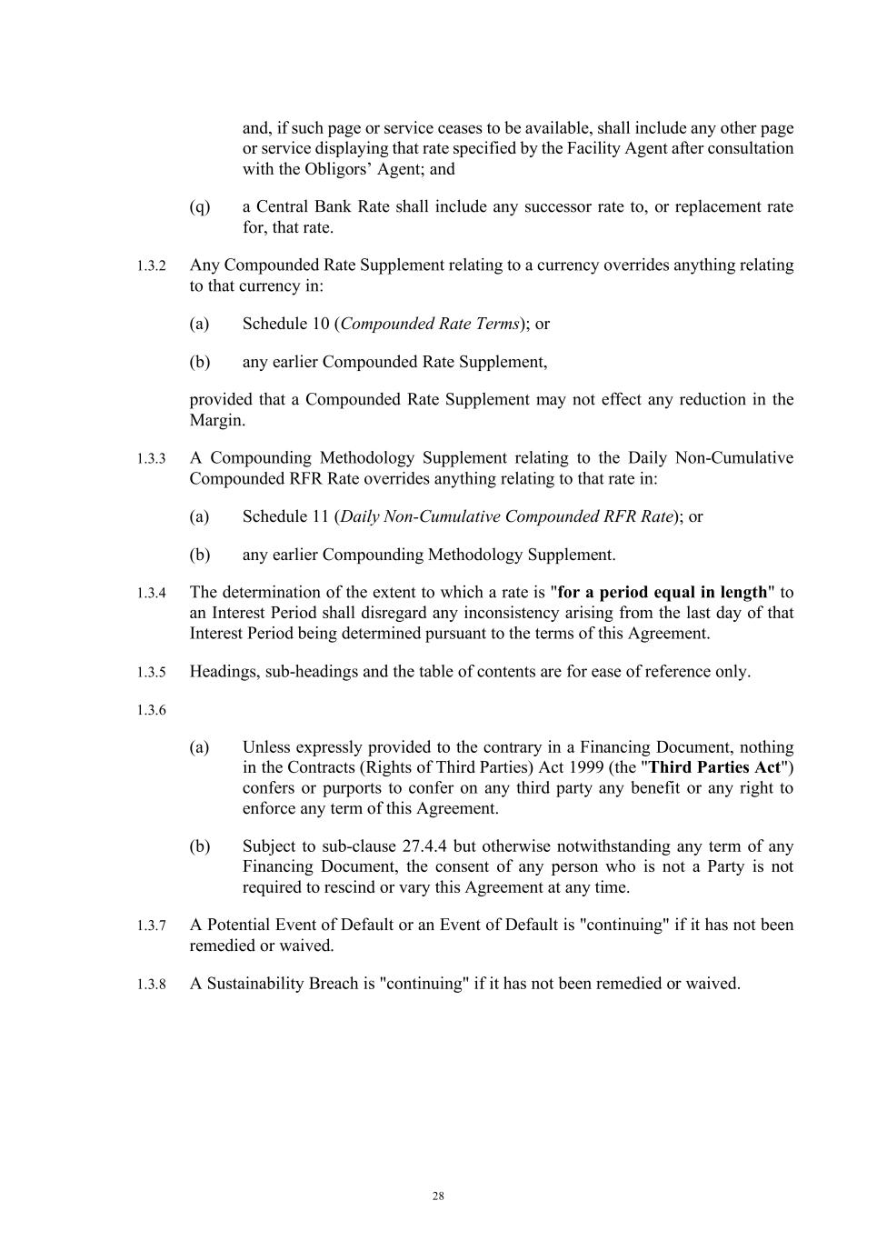 28 and, if such page or service ceases to be available, shall include any other page or service displaying that rate specified by the Facility Agent after consultation with the Obligors’ Agent; and (q) a Central Bank Rate shall include any successor rate to, or replacement rate for, that rate. 1.3.2 Any Compounded Rate Supplement relating to a currency overrides anything relating to that currency in: (a) Schedule 10 (Compounded Rate Terms); or (b) any earlier Compounded Rate Supplement, provided that a Compounded Rate Supplement may not effect any reduction in the Margin. 1.3.3 A Compounding Methodology Supplement relating to the Daily Non-Cumulative Compounded RFR Rate overrides anything relating to that rate in: (a) Schedule 11 (Daily Non-Cumulative Compounded RFR Rate); or (b) any earlier Compounding Methodology Supplement. 1.3.4 The determination of the extent to which a rate is "for a period equal in length" to an Interest Period shall disregard any inconsistency arising from the last day of that Interest Period being determined pursuant to the terms of this Agreement. 1.3.5 Headings, sub-headings and the table of contents are for ease of reference only. 1.3.6 (a) Unless expressly provided to the contrary in a Financing Document, nothing in the Contracts (Rights of Third Parties) Act 1999 (the "Third Parties Act") confers or purports to confer on any third party any benefit or any right to enforce any term of this Agreement. (b) Subject to sub-clause 27.4.4 but otherwise notwithstanding any term of any Financing Document, the consent of any person who is not a Party is not required to rescind or vary this Agreement at any time. 1.3.7 A Potential Event of Default or an Event of Default is "continuing" if it has not been remedied or waived. 1.3.8 A Sustainability Breach is "continuing" if it has not been remedied or waived.