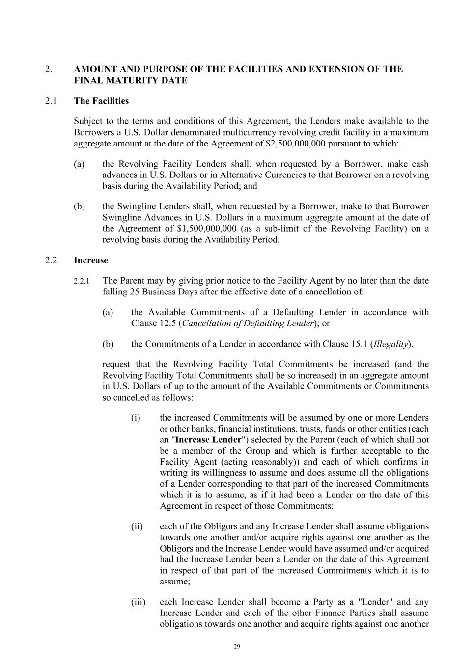 29 2. AMOUNT AND PURPOSE OF THE FACILITIES AND EXTENSION OF THE FINAL MATURITY DATE 2.1 The Facilities Subject to the terms and conditions of this Agreement, the Lenders make available to the Borrowers a U.S. Dollar denominated multicurrency revolving credit facility in a maximum aggregate amount at the date of the Agreement of $2,500,000,000 pursuant to which: (a) the Revolving Facility Lenders shall, when requested by a Borrower, make cash advances in U.S. Dollars or in Alternative Currencies to that Borrower on a revolving basis during the Availability Period; and (b) the Swingline Lenders shall, when requested by a Borrower, make to that Borrower Swingline Advances in U.S. Dollars in a maximum aggregate amount at the date of the Agreement of $1,500,000,000 (as a sub-limit of the Revolving Facility) on a revolving basis during the Availability Period. 2.2 Increase 2.2.1 The Parent may by giving prior notice to the Facility Agent by no later than the date falling 25 Business Days after the effective date of a cancellation of: (a) the Available Commitments of a Defaulting Lender in accordance with Clause 12.5 (Cancellation of Defaulting Lender); or (b) the Commitments of a Lender in accordance with Clause 15.1 (Illegality), request that the Revolving Facility Total Commitments be increased (and the Revolving Facility Total Commitments shall be so increased) in an aggregate amount in U.S. Dollars of up to the amount of the Available Commitments or Commitments so cancelled as follows: (i) the increased Commitments will be assumed by one or more Lenders or other banks, financial institutions, trusts, funds or other entities (each an "Increase Lender") selected by the Parent (each of which shall not be a member of the Group and which is further acceptable to the Facility Agent (acting reasonably)) and each of which confirms in writing its willingness to assume and does assume all the obligations of a Lender corresponding to that part of the increased Commitments which it is to assume, as if it had been a Lender on the date of this Agreement in respect of those Commitments; (ii) each of the Obligors and any Increase Lender shall assume obligations towards one another and/or acquire rights against one another as the Obligors and the Increase Lender would have assumed and/or acquired had the Increase Lender been a Lender on the date of this Agreement in respect of that part of the increased Commitments which it is to assume; (iii) each Increase Lender shall become a Party as a "Lender" and any Increase Lender and each of the other Finance Parties shall assume obligations towards one another and acquire rights against one another