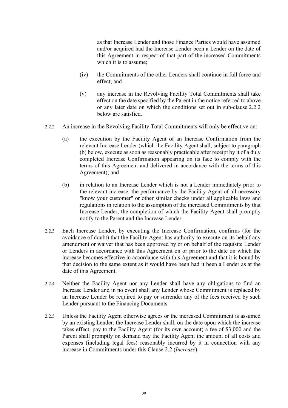 30 as that Increase Lender and those Finance Parties would have assumed and/or acquired had the Increase Lender been a Lender on the date of this Agreement in respect of that part of the increased Commitments which it is to assume; (iv) the Commitments of the other Lenders shall continue in full force and effect; and (v) any increase in the Revolving Facility Total Commitments shall take effect on the date specified by the Parent in the notice referred to above or any later date on which the conditions set out in sub-clause 2.2.2 below are satisfied. 2.2.2 An increase in the Revolving Facility Total Commitments will only be effective on: (a) the execution by the Facility Agent of an Increase Confirmation from the relevant Increase Lender (which the Facility Agent shall, subject to paragraph (b) below, execute as soon as reasonably practicable after receipt by it of a duly completed Increase Confirmation appearing on its face to comply with the terms of this Agreement and delivered in accordance with the terms of this Agreement); and (b) in relation to an Increase Lender which is not a Lender immediately prior to the relevant increase, the performance by the Facility Agent of all necessary "know your customer" or other similar checks under all applicable laws and regulations in relation to the assumption of the increased Commitments by that Increase Lender, the completion of which the Facility Agent shall promptly notify to the Parent and the Increase Lender. 2.2.3 Each Increase Lender, by executing the Increase Confirmation, confirms (for the avoidance of doubt) that the Facility Agent has authority to execute on its behalf any amendment or waiver that has been approved by or on behalf of the requisite Lender or Lenders in accordance with this Agreement on or prior to the date on which the increase becomes effective in accordance with this Agreement and that it is bound by that decision to the same extent as it would have been had it been a Lender as at the date of this Agreement. 2.2.4 Neither the Facility Agent nor any Lender shall have any obligations to find an Increase Lender and in no event shall any Lender whose Commitment is replaced by an Increase Lender be required to pay or surrender any of the fees received by such Lender pursuant to the Financing Documents. 2.2.5 Unless the Facility Agent otherwise agrees or the increased Commitment is assumed by an existing Lender, the Increase Lender shall, on the date upon which the increase takes effect, pay to the Facility Agent (for its own account) a fee of $3,000 and the Parent shall promptly on demand pay the Facility Agent the amount of all costs and expenses (including legal fees) reasonably incurred by it in connection with any increase in Commitments under this Clause 2.2 (Increase).