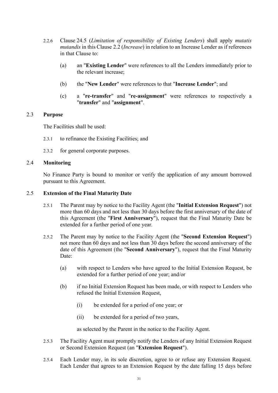 31 2.2.6 Clause 24.5 (Limitation of responsibility of Existing Lenders) shall apply mutatis mutandis in this Clause 2.2 (Increase) in relation to an Increase Lender as if references in that Clause to: (a) an "Existing Lender" were references to all the Lenders immediately prior to the relevant increase; (b) the "New Lender" were references to that "Increase Lender"; and (c) a "re-transfer" and "re-assignment" were references to respectively a "transfer" and "assignment". 2.3 Purpose The Facilities shall be used: 2.3.1 to refinance the Existing Facilities; and 2.3.2 for general corporate purposes. 2.4 Monitoring No Finance Party is bound to monitor or verify the application of any amount borrowed pursuant to this Agreement. 2.5 Extension of the Final Maturity Date 2.5.1 The Parent may by notice to the Facility Agent (the "Initial Extension Request") not more than 60 days and not less than 30 days before the first anniversary of the date of this Agreement (the "First Anniversary"), request that the Final Maturity Date be extended for a further period of one year. 2.5.2 The Parent may by notice to the Facility Agent (the "Second Extension Request") not more than 60 days and not less than 30 days before the second anniversary of the date of this Agreement (the "Second Anniversary"), request that the Final Maturity Date: (a) with respect to Lenders who have agreed to the Initial Extension Request, be extended for a further period of one year; and/or (b) if no Initial Extension Request has been made, or with respect to Lenders who refused the Initial Extension Request, (i) be extended for a period of one year; or (ii) be extended for a period of two years, as selected by the Parent in the notice to the Facility Agent. 2.5.3 The Facility Agent must promptly notify the Lenders of any Initial Extension Request or Second Extension Request (an "Extension Request"). 2.5.4 Each Lender may, in its sole discretion, agree to or refuse any Extension Request. Each Lender that agrees to an Extension Request by the date falling 15 days before
