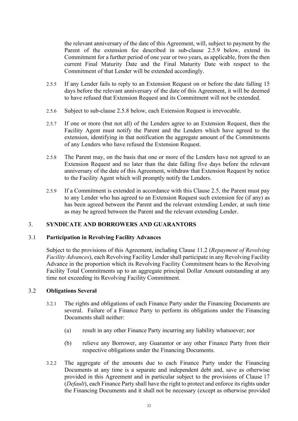 32 the relevant anniversary of the date of this Agreement, will, subject to payment by the Parent of the extension fee described in sub-clause 2.5.9 below, extend its Commitment for a further period of one year or two years, as applicable, from the then current Final Maturity Date and the Final Maturity Date with respect to the Commitment of that Lender will be extended accordingly. 2.5.5 If any Lender fails to reply to an Extension Request on or before the date falling 15 days before the relevant anniversary of the date of this Agreement, it will be deemed to have refused that Extension Request and its Commitment will not be extended. 2.5.6 Subject to sub-clause 2.5.8 below, each Extension Request is irrevocable. 2.5.7 If one or more (but not all) of the Lenders agree to an Extension Request, then the Facility Agent must notify the Parent and the Lenders which have agreed to the extension, identifying in that notification the aggregate amount of the Commitments of any Lenders who have refused the Extension Request. 2.5.8 The Parent may, on the basis that one or more of the Lenders have not agreed to an Extension Request and no later than the date falling five days before the relevant anniversary of the date of this Agreement, withdraw that Extension Request by notice to the Facility Agent which will promptly notify the Lenders. 2.5.9 If a Commitment is extended in accordance with this Clause 2.5, the Parent must pay to any Lender who has agreed to an Extension Request such extension fee (if any) as has been agreed between the Parent and the relevant extending Lender, at such time as may be agreed between the Parent and the relevant extending Lender. 3. SYNDICATE AND BORROWERS AND GUARANTORS 3.1 Participation in Revolving Facility Advances Subject to the provisions of this Agreement, including Clause 11.2 (Repayment of Revolving Facility Advances), each Revolving Facility Lender shall participate in any Revolving Facility Advance in the proportion which its Revolving Facility Commitment bears to the Revolving Facility Total Commitments up to an aggregate principal Dollar Amount outstanding at any time not exceeding its Revolving Facility Commitment. 3.2 Obligations Several 3.2.1 The rights and obligations of each Finance Party under the Financing Documents are several. Failure of a Finance Party to perform its obligations under the Financing Documents shall neither: (a) result in any other Finance Party incurring any liability whatsoever; nor (b) relieve any Borrower, any Guarantor or any other Finance Party from their respective obligations under the Financing Documents. 3.2.2 The aggregate of the amounts due to each Finance Party under the Financing Documents at any time is a separate and independent debt and, save as otherwise provided in this Agreement and in particular subject to the provisions of Clause 17 (Default), each Finance Party shall have the right to protect and enforce its rights under the Financing Documents and it shall not be necessary (except as otherwise provided