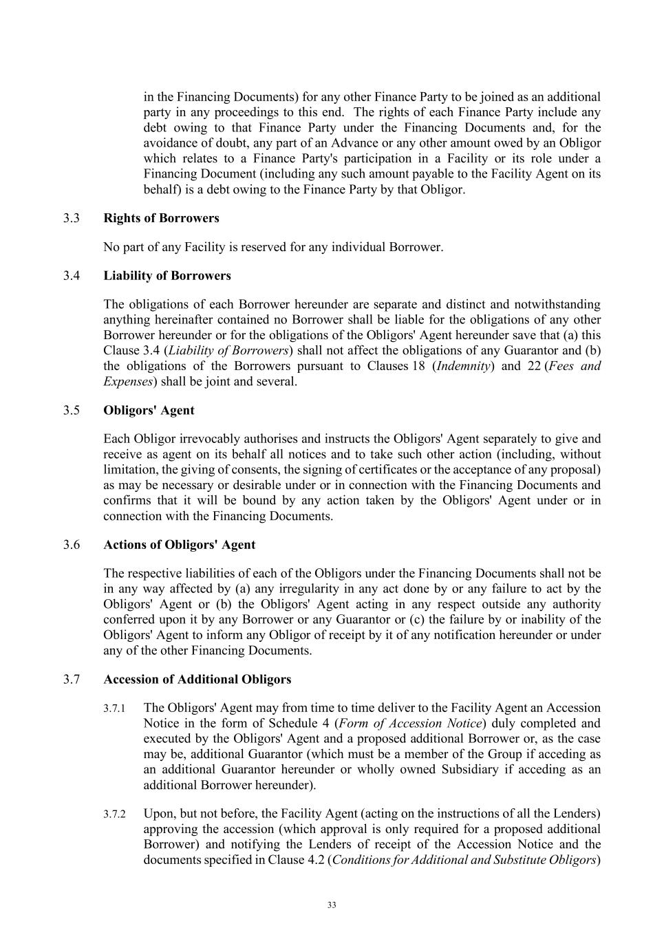 33 in the Financing Documents) for any other Finance Party to be joined as an additional party in any proceedings to this end. The rights of each Finance Party include any debt owing to that Finance Party under the Financing Documents and, for the avoidance of doubt, any part of an Advance or any other amount owed by an Obligor which relates to a Finance Party's participation in a Facility or its role under a Financing Document (including any such amount payable to the Facility Agent on its behalf) is a debt owing to the Finance Party by that Obligor. 3.3 Rights of Borrowers No part of any Facility is reserved for any individual Borrower. 3.4 Liability of Borrowers The obligations of each Borrower hereunder are separate and distinct and notwithstanding anything hereinafter contained no Borrower shall be liable for the obligations of any other Borrower hereunder or for the obligations of the Obligors' Agent hereunder save that (a) this Clause 3.4 (Liability of Borrowers) shall not affect the obligations of any Guarantor and (b) the obligations of the Borrowers pursuant to Clauses 18 (Indemnity) and 22 (Fees and Expenses) shall be joint and several. 3.5 Obligors' Agent Each Obligor irrevocably authorises and instructs the Obligors' Agent separately to give and receive as agent on its behalf all notices and to take such other action (including, without limitation, the giving of consents, the signing of certificates or the acceptance of any proposal) as may be necessary or desirable under or in connection with the Financing Documents and confirms that it will be bound by any action taken by the Obligors' Agent under or in connection with the Financing Documents. 3.6 Actions of Obligors' Agent The respective liabilities of each of the Obligors under the Financing Documents shall not be in any way affected by (a) any irregularity in any act done by or any failure to act by the Obligors' Agent or (b) the Obligors' Agent acting in any respect outside any authority conferred upon it by any Borrower or any Guarantor or (c) the failure by or inability of the Obligors' Agent to inform any Obligor of receipt by it of any notification hereunder or under any of the other Financing Documents. 3.7 Accession of Additional Obligors 3.7.1 The Obligors' Agent may from time to time deliver to the Facility Agent an Accession Notice in the form of Schedule 4 (Form of Accession Notice) duly completed and executed by the Obligors' Agent and a proposed additional Borrower or, as the case may be, additional Guarantor (which must be a member of the Group if acceding as an additional Guarantor hereunder or wholly owned Subsidiary if acceding as an additional Borrower hereunder). 3.7.2 Upon, but not before, the Facility Agent (acting on the instructions of all the Lenders) approving the accession (which approval is only required for a proposed additional Borrower) and notifying the Lenders of receipt of the Accession Notice and the documents specified in Clause 4.2 (Conditions for Additional and Substitute Obligors)