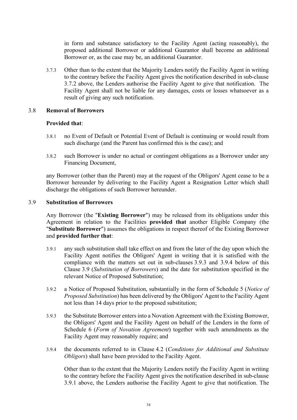 34 in form and substance satisfactory to the Facility Agent (acting reasonably), the proposed additional Borrower or additional Guarantor shall become an additional Borrower or, as the case may be, an additional Guarantor. 3.7.3 Other than to the extent that the Majority Lenders notify the Facility Agent in writing to the contrary before the Facility Agent gives the notification described in sub-clause 3.7.2 above, the Lenders authorise the Facility Agent to give that notification. The Facility Agent shall not be liable for any damages, costs or losses whatsoever as a result of giving any such notification. 3.8 Removal of Borrowers Provided that: 3.8.1 no Event of Default or Potential Event of Default is continuing or would result from such discharge (and the Parent has confirmed this is the case); and 3.8.2 such Borrower is under no actual or contingent obligations as a Borrower under any Financing Document, any Borrower (other than the Parent) may at the request of the Obligors' Agent cease to be a Borrower hereunder by delivering to the Facility Agent a Resignation Letter which shall discharge the obligations of such Borrower hereunder. 3.9 Substitution of Borrowers Any Borrower (the "Existing Borrower") may be released from its obligations under this Agreement in relation to the Facilities provided that another Eligible Company (the "Substitute Borrower") assumes the obligations in respect thereof of the Existing Borrower and provided further that: 3.9.1 any such substitution shall take effect on and from the later of the day upon which the Facility Agent notifies the Obligors' Agent in writing that it is satisfied with the compliance with the matters set out in sub-clauses 3.9.3 and 3.9.4 below of this Clause 3.9 (Substitution of Borrowers) and the date for substitution specified in the relevant Notice of Proposed Substitution; 3.9.2 a Notice of Proposed Substitution, substantially in the form of Schedule 5 (Notice of Proposed Substitution) has been delivered by the Obligors' Agent to the Facility Agent not less than 14 days prior to the proposed substitution; 3.9.3 the Substitute Borrower enters into a Novation Agreement with the Existing Borrower, the Obligors' Agent and the Facility Agent on behalf of the Lenders in the form of Schedule 6 (Form of Novation Agreement) together with such amendments as the Facility Agent may reasonably require; and 3.9.4 the documents referred to in Clause 4.2 (Conditions for Additional and Substitute Obligors) shall have been provided to the Facility Agent. Other than to the extent that the Majority Lenders notify the Facility Agent in writing to the contrary before the Facility Agent gives the notification described in sub-clause 3.9.1 above, the Lenders authorise the Facility Agent to give that notification. The