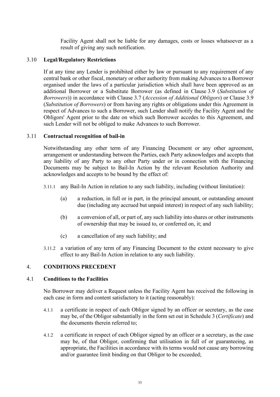 35 Facility Agent shall not be liable for any damages, costs or losses whatsoever as a result of giving any such notification. 3.10 Legal/Regulatory Restrictions If at any time any Lender is prohibited either by law or pursuant to any requirement of any central bank or other fiscal, monetary or other authority from making Advances to a Borrower organised under the laws of a particular jurisdiction which shall have been approved as an additional Borrower or a Substitute Borrower (as defined in Clause 3.9 (Substitution of Borrowers)) in accordance with Clause 3.7 (Accession of Additional Obligors) or Clause 3.9 (Substitution of Borrowers) or from having any rights or obligations under this Agreement in respect of Advances to such a Borrower, such Lender shall notify the Facility Agent and the Obligors' Agent prior to the date on which such Borrower accedes to this Agreement, and such Lender will not be obliged to make Advances to such Borrower. 3.11 Contractual recognition of bail-in Notwithstanding any other term of any Financing Document or any other agreement, arrangement or understanding between the Parties, each Party acknowledges and accepts that any liability of any Party to any other Party under or in connection with the Financing Documents may be subject to Bail-In Action by the relevant Resolution Authority and acknowledges and accepts to be bound by the effect of: 3.11.1 any Bail-In Action in relation to any such liability, including (without limitation): (a) a reduction, in full or in part, in the principal amount, or outstanding amount due (including any accrued but unpaid interest) in respect of any such liability; (b) a conversion of all, or part of, any such liability into shares or other instruments of ownership that may be issued to, or conferred on, it; and (c) a cancellation of any such liability; and 3.11.2 a variation of any term of any Financing Document to the extent necessary to give effect to any Bail-In Action in relation to any such liability. 4. CONDITIONS PRECEDENT 4.1 Conditions to the Facilities No Borrower may deliver a Request unless the Facility Agent has received the following in each case in form and content satisfactory to it (acting reasonably): 4.1.1 a certificate in respect of each Obligor signed by an officer or secretary, as the case may be, of the Obligor substantially in the form set out in Schedule 3 (Certificate) and the documents therein referred to; 4.1.2 a certificate in respect of each Obligor signed by an officer or a secretary, as the case may be, of that Obligor, confirming that utilisation in full of or guaranteeing, as appropriate, the Facilities in accordance with its terms would not cause any borrowing and/or guarantee limit binding on that Obligor to be exceeded;