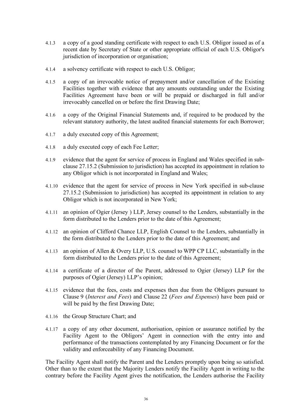 36 4.1.3 a copy of a good standing certificate with respect to each U.S. Obligor issued as of a recent date by Secretary of State or other appropriate official of each U.S. Obligor's jurisdiction of incorporation or organisation; 4.1.4 a solvency certificate with respect to each U.S. Obligor; 4.1.5 a copy of an irrevocable notice of prepayment and/or cancellation of the Existing Facilities together with evidence that any amounts outstanding under the Existing Facilities Agreement have been or will be prepaid or discharged in full and/or irrevocably cancelled on or before the first Drawing Date; 4.1.6 a copy of the Original Financial Statements and, if required to be produced by the relevant statutory authority, the latest audited financial statements for each Borrower; 4.1.7 a duly executed copy of this Agreement; 4.1.8 a duly executed copy of each Fee Letter; 4.1.9 evidence that the agent for service of process in England and Wales specified in sub- clause 27.15.2 (Submission to jurisdiction) has accepted its appointment in relation to any Obligor which is not incorporated in England and Wales; 4.1.10 evidence that the agent for service of process in New York specified in sub-clause 27.15.2 (Submission to jurisdiction) has accepted its appointment in relation to any Obligor which is not incorporated in New York; 4.1.11 an opinion of Ogier (Jersey ) LLP, Jersey counsel to the Lenders, substantially in the form distributed to the Lenders prior to the date of this Agreement; 4.1.12 an opinion of Clifford Chance LLP, English Counsel to the Lenders, substantially in the form distributed to the Lenders prior to the date of this Agreement; and 4.1.13 an opinion of Allen & Overy LLP, U.S. counsel to WPP CP LLC, substantially in the form distributed to the Lenders prior to the date of this Agreement; 4.1.14 a certificate of a director of the Parent, addressed to Ogier (Jersey) LLP for the purposes of Ogier (Jersey) LLP’s opinion; 4.1.15 evidence that the fees, costs and expenses then due from the Obligors pursuant to Clause 9 (Interest and Fees) and Clause 22 (Fees and Expenses) have been paid or will be paid by the first Drawing Date; 4.1.16 the Group Structure Chart; and 4.1.17 a copy of any other document, authorisation, opinion or assurance notified by the Facility Agent to the Obligors’ Agent in connection with the entry into and performance of the transactions contemplated by any Financing Document or for the validity and enforceability of any Financing Document. The Facility Agent shall notify the Parent and the Lenders promptly upon being so satisfied. Other than to the extent that the Majority Lenders notify the Facility Agent in writing to the contrary before the Facility Agent gives the notification, the Lenders authorise the Facility