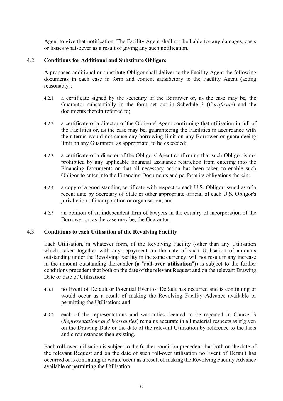 37 Agent to give that notification. The Facility Agent shall not be liable for any damages, costs or losses whatsoever as a result of giving any such notification. 4.2 Conditions for Additional and Substitute Obligors A proposed additional or substitute Obligor shall deliver to the Facility Agent the following documents in each case in form and content satisfactory to the Facility Agent (acting reasonably): 4.2.1 a certificate signed by the secretary of the Borrower or, as the case may be, the Guarantor substantially in the form set out in Schedule 3 (Certificate) and the documents therein referred to; 4.2.2 a certificate of a director of the Obligors' Agent confirming that utilisation in full of the Facilities or, as the case may be, guaranteeing the Facilities in accordance with their terms would not cause any borrowing limit on any Borrower or guaranteeing limit on any Guarantor, as appropriate, to be exceeded; 4.2.3 a certificate of a director of the Obligors' Agent confirming that such Obligor is not prohibited by any applicable financial assistance restriction from entering into the Financing Documents or that all necessary action has been taken to enable such Obligor to enter into the Financing Documents and perform its obligations therein; 4.2.4 a copy of a good standing certificate with respect to each U.S. Obligor issued as of a recent date by Secretary of State or other appropriate official of each U.S. Obligor's jurisdiction of incorporation or organisation; and 4.2.5 an opinion of an independent firm of lawyers in the country of incorporation of the Borrower or, as the case may be, the Guarantor. 4.3 Conditions to each Utilisation of the Revolving Facility Each Utilisation, in whatever form, of the Revolving Facility (other than any Utilisation which, taken together with any repayment on the date of such Utilisation of amounts outstanding under the Revolving Facility in the same currency, will not result in any increase in the amount outstanding thereunder (a "roll-over utilisation")) is subject to the further conditions precedent that both on the date of the relevant Request and on the relevant Drawing Date or date of Utilisation: 4.3.1 no Event of Default or Potential Event of Default has occurred and is continuing or would occur as a result of making the Revolving Facility Advance available or permitting the Utilisation; and 4.3.2 each of the representations and warranties deemed to be repeated in Clause 13 (Representations and Warranties) remains accurate in all material respects as if given on the Drawing Date or the date of the relevant Utilisation by reference to the facts and circumstances then existing. Each roll-over utilisation is subject to the further condition precedent that both on the date of the relevant Request and on the date of such roll-over utilisation no Event of Default has occurred or is continuing or would occur as a result of making the Revolving Facility Advance available or permitting the Utilisation.