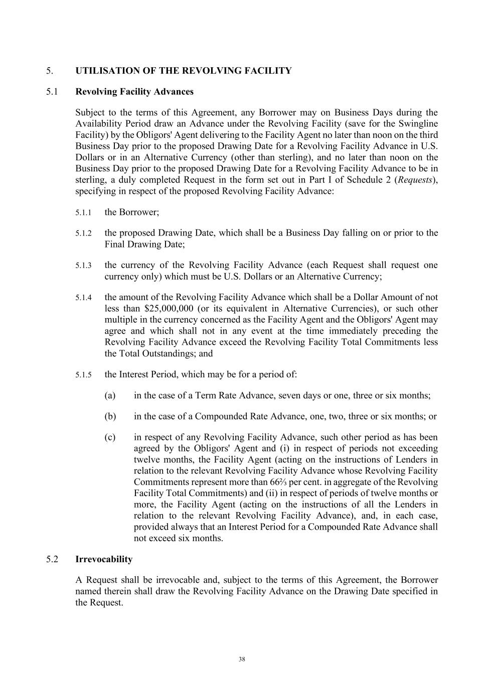 38 5. UTILISATION OF THE REVOLVING FACILITY 5.1 Revolving Facility Advances Subject to the terms of this Agreement, any Borrower may on Business Days during the Availability Period draw an Advance under the Revolving Facility (save for the Swingline Facility) by the Obligors' Agent delivering to the Facility Agent no later than noon on the third Business Day prior to the proposed Drawing Date for a Revolving Facility Advance in U.S. Dollars or in an Alternative Currency (other than sterling), and no later than noon on the Business Day prior to the proposed Drawing Date for a Revolving Facility Advance to be in sterling, a duly completed Request in the form set out in Part I of Schedule 2 (Requests), specifying in respect of the proposed Revolving Facility Advance: 5.1.1 the Borrower; 5.1.2 the proposed Drawing Date, which shall be a Business Day falling on or prior to the Final Drawing Date; 5.1.3 the currency of the Revolving Facility Advance (each Request shall request one currency only) which must be U.S. Dollars or an Alternative Currency; 5.1.4 the amount of the Revolving Facility Advance which shall be a Dollar Amount of not less than $25,000,000 (or its equivalent in Alternative Currencies), or such other multiple in the currency concerned as the Facility Agent and the Obligors' Agent may agree and which shall not in any event at the time immediately preceding the Revolving Facility Advance exceed the Revolving Facility Total Commitments less the Total Outstandings; and 5.1.5 the Interest Period, which may be for a period of: (a) in the case of a Term Rate Advance, seven days or one, three or six months; (b) in the case of a Compounded Rate Advance, one, two, three or six months; or (c) in respect of any Revolving Facility Advance, such other period as has been agreed by the Obligors' Agent and (i) in respect of periods not exceeding twelve months, the Facility Agent (acting on the instructions of Lenders in relation to the relevant Revolving Facility Advance whose Revolving Facility Commitments represent more than 66⅔ per cent. in aggregate of the Revolving Facility Total Commitments) and (ii) in respect of periods of twelve months or more, the Facility Agent (acting on the instructions of all the Lenders in relation to the relevant Revolving Facility Advance), and, in each case, provided always that an Interest Period for a Compounded Rate Advance shall not exceed six months. 5.2 Irrevocability A Request shall be irrevocable and, subject to the terms of this Agreement, the Borrower named therein shall draw the Revolving Facility Advance on the Drawing Date specified in the Request.